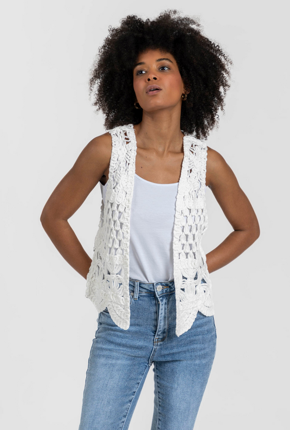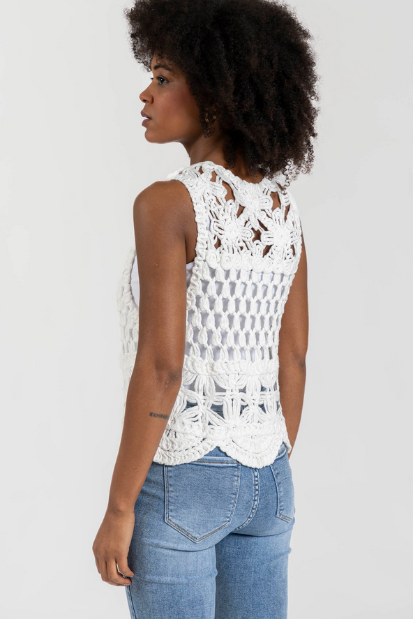 Ref. 1701708601 Tejido de algodón. Tejido de crochet. Diseño recto. Diseño calado. Manga sisa. Sin cierre. Bajo asimétrico. Talla S/M. Altura modelo: 1,66 m. Composición: 95% Algodón, 5% Poliamida . Hecho en P.R.C