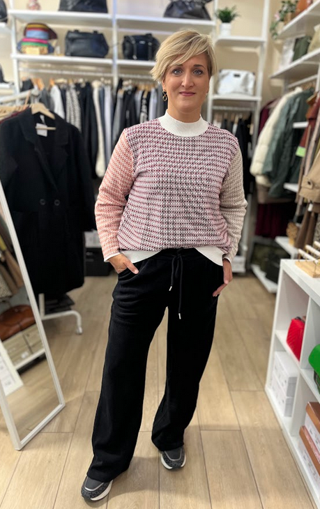 Ref. JR W224041 Jersey manga larga, corte recto, cuello tipo perkins, estampado jacquard en granate, naranja, beige y fondo blanco