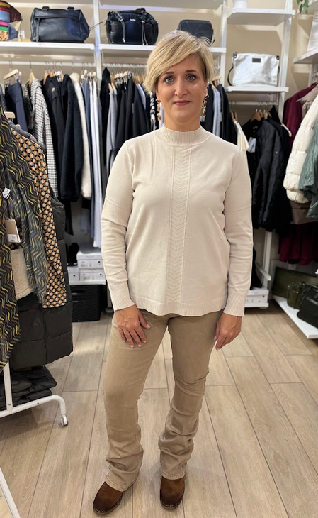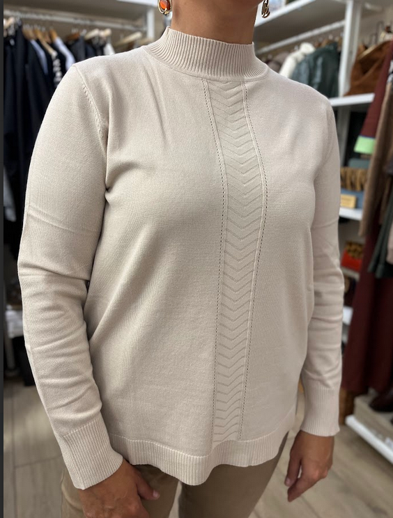 Ref. JR 0424291 Jersey fino básico en color beige, manga larga, corte recto, cuello tipo perkins, dibujo en la parte central delantera.
