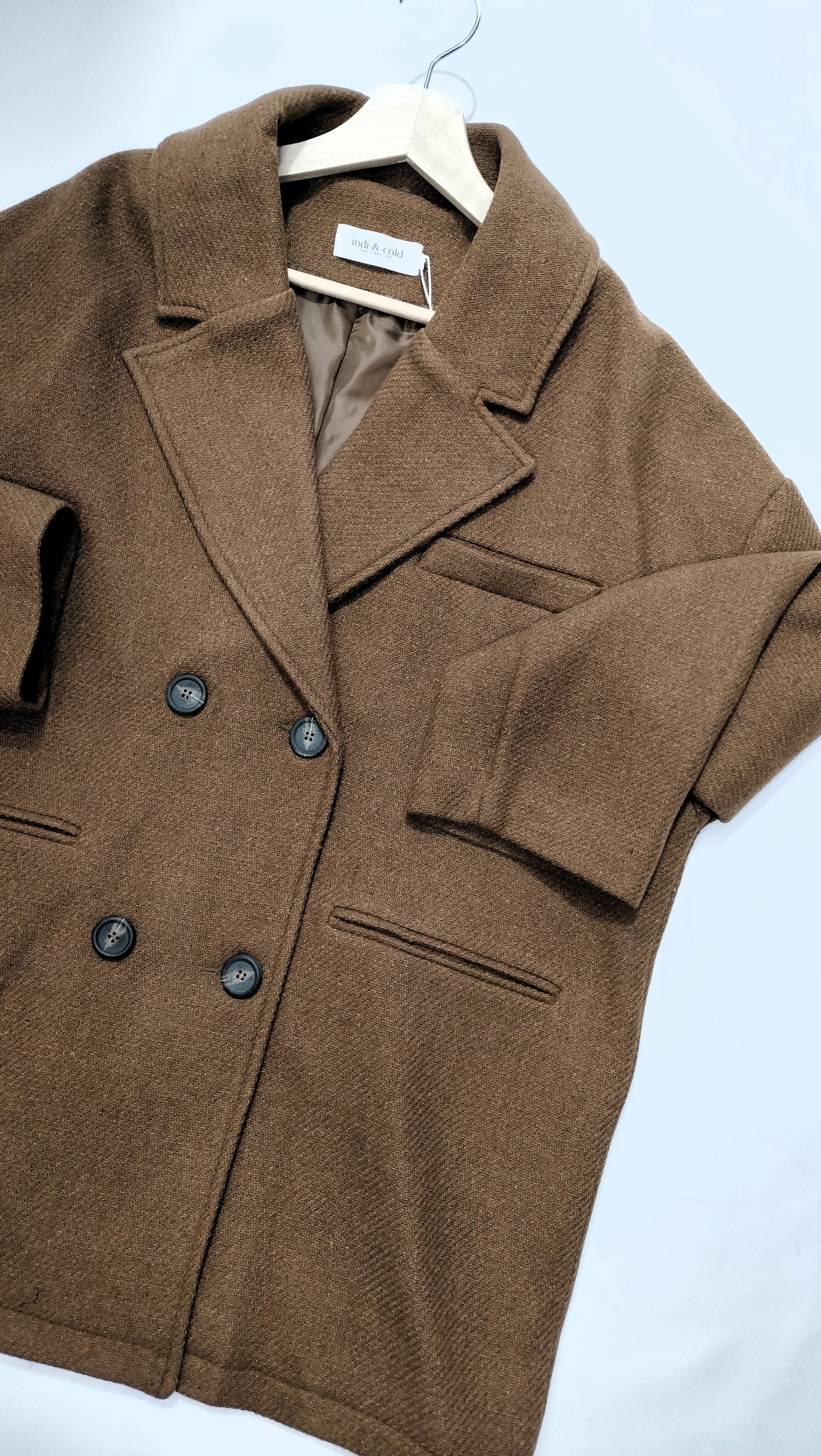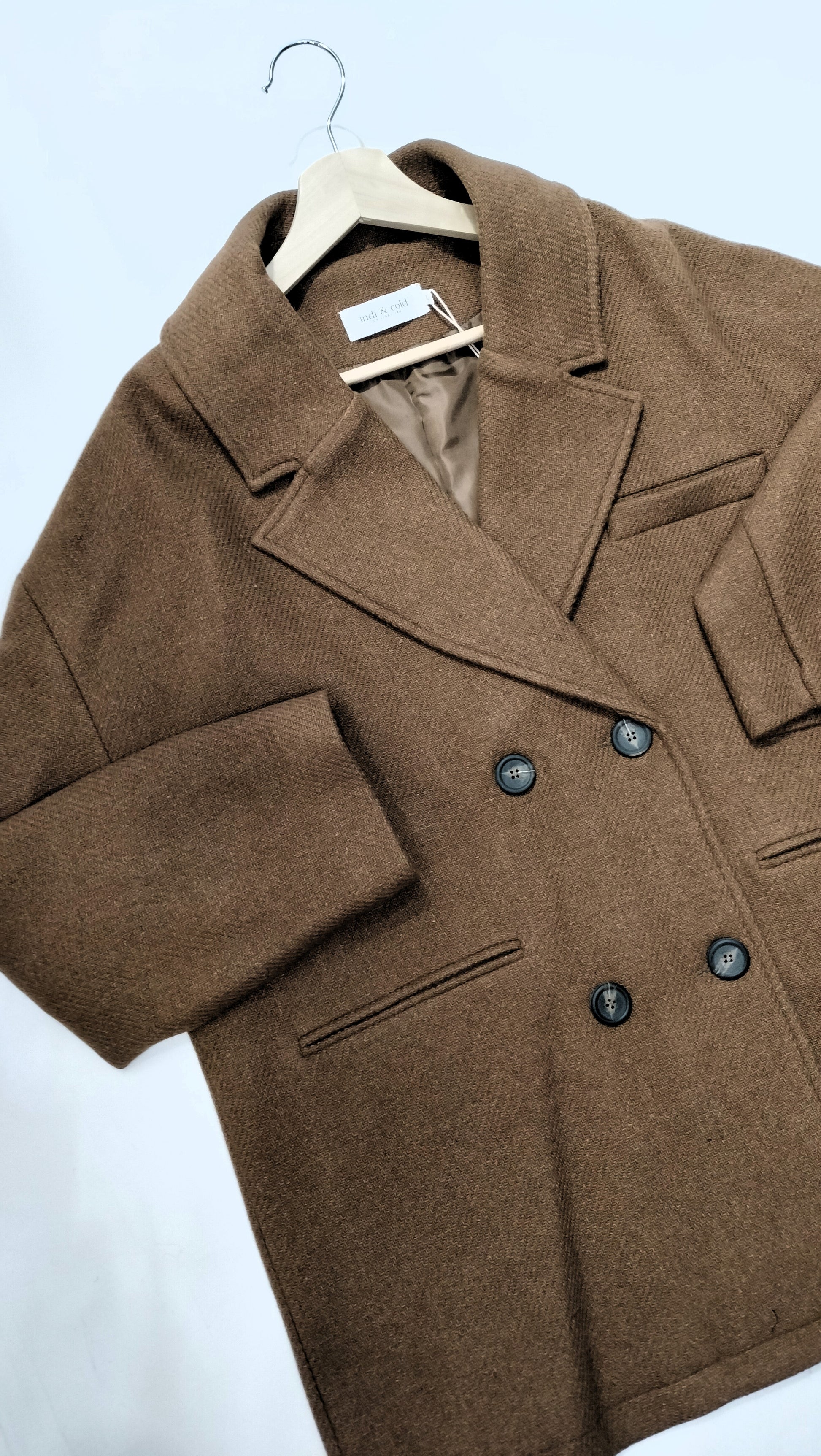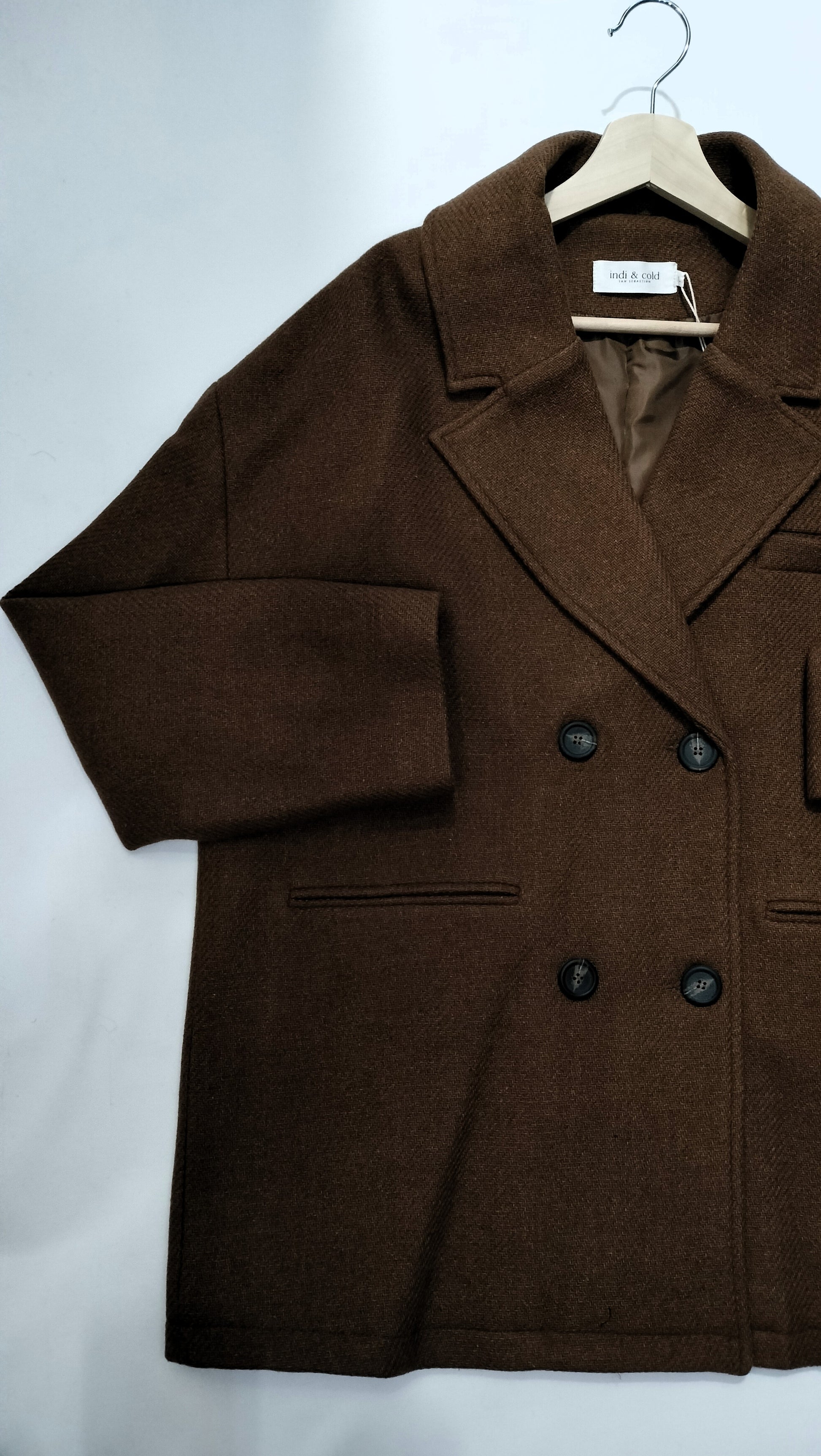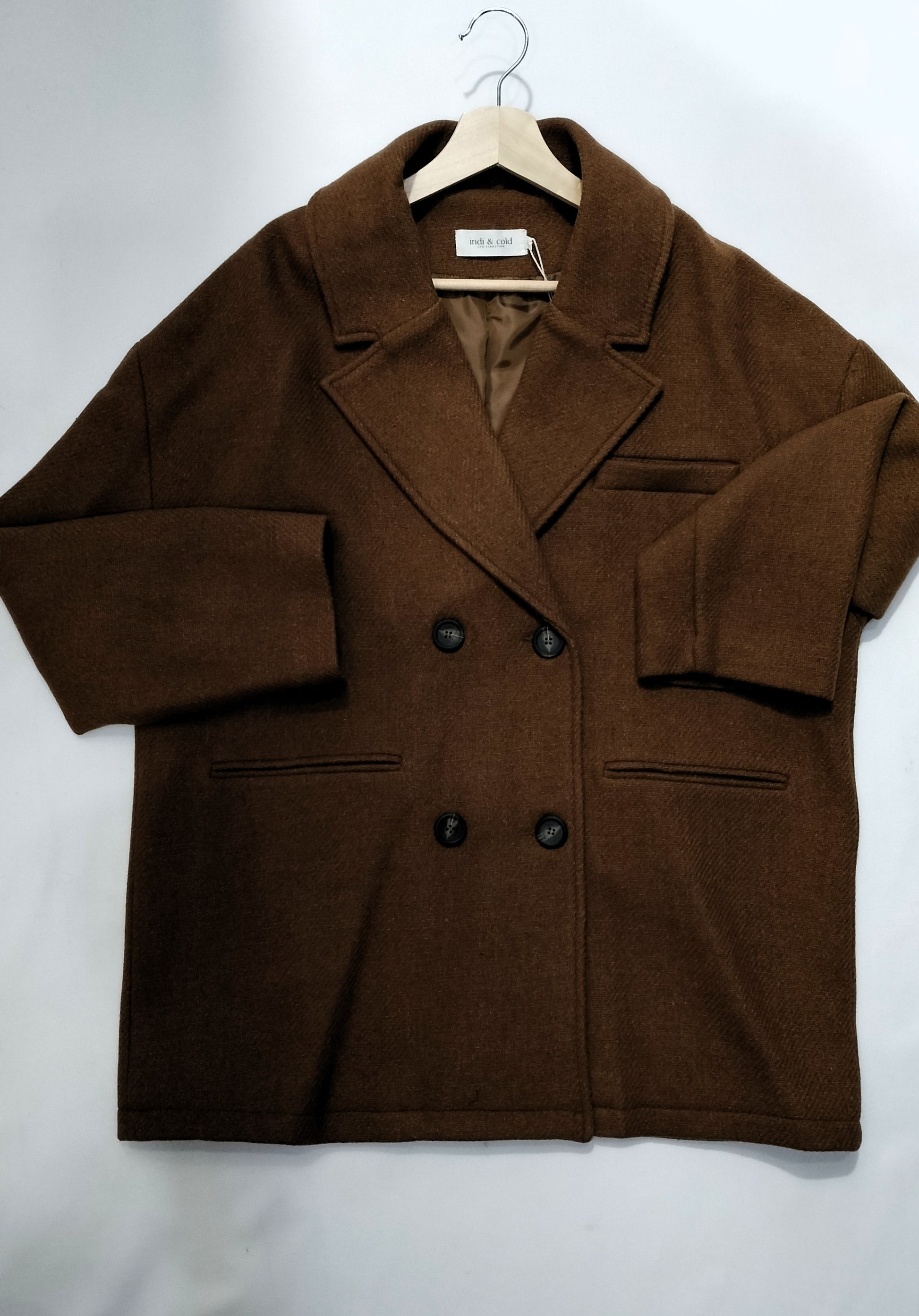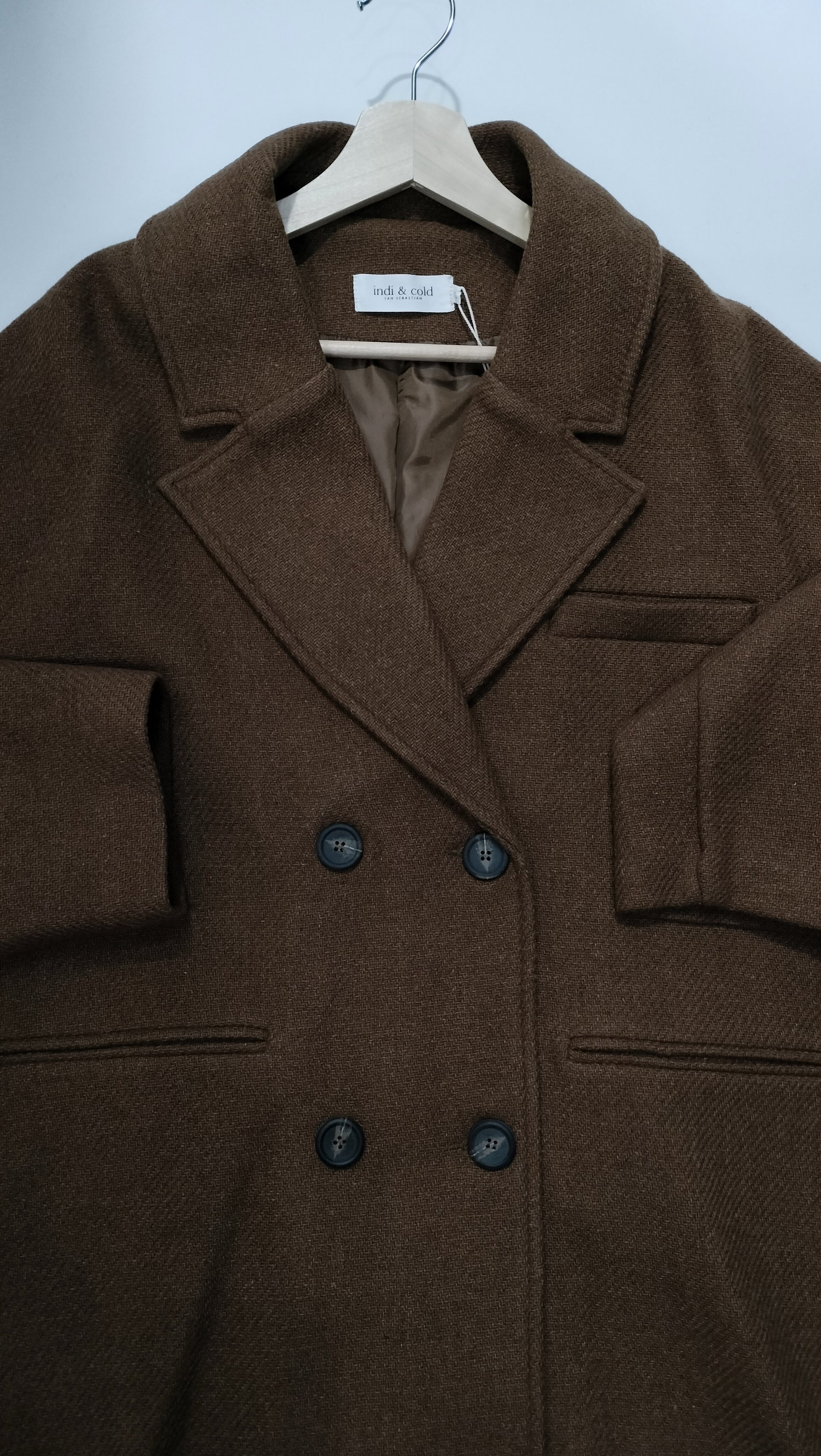 Ref. JR VI23LL741 Abrigo de lana, manga larga, corte recto, largo debajo de la cadera, cierre con botones, escote tipo V con solapa, 2 bolsillos. Color marrón