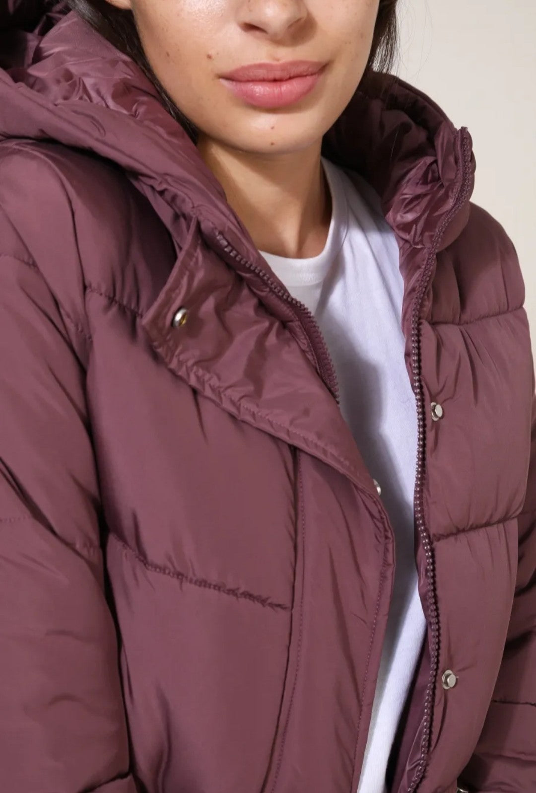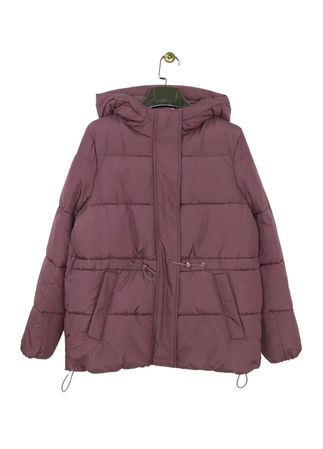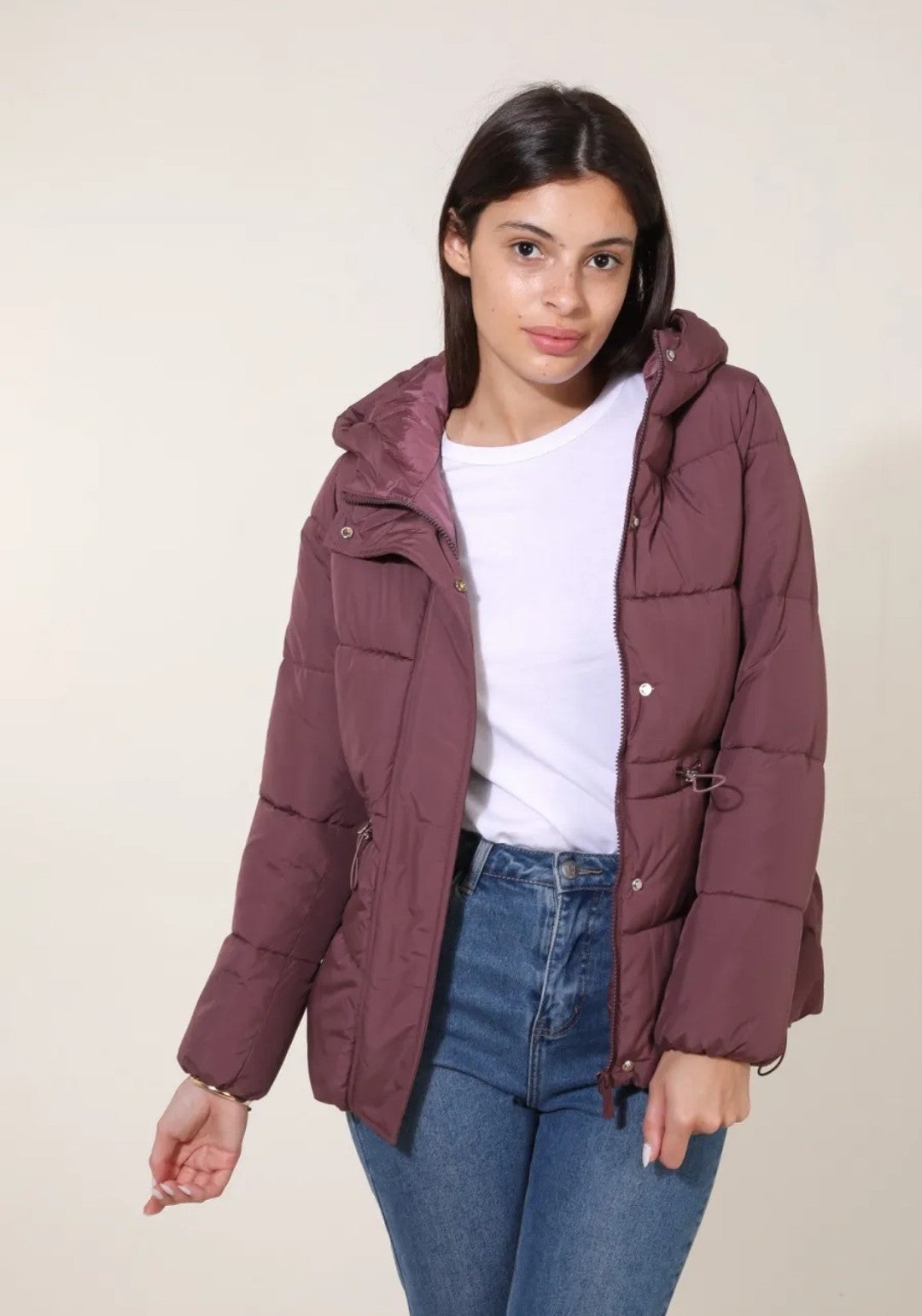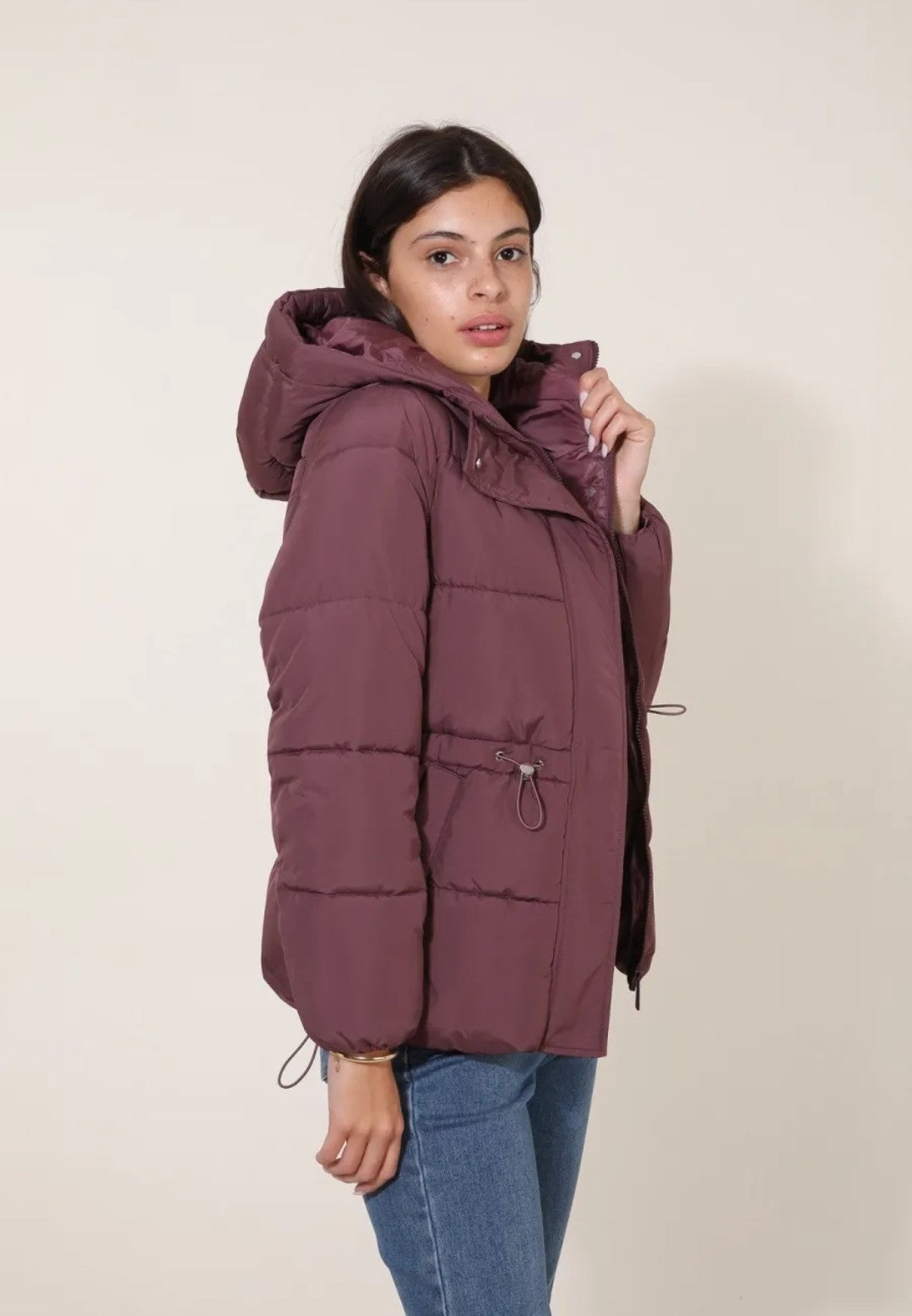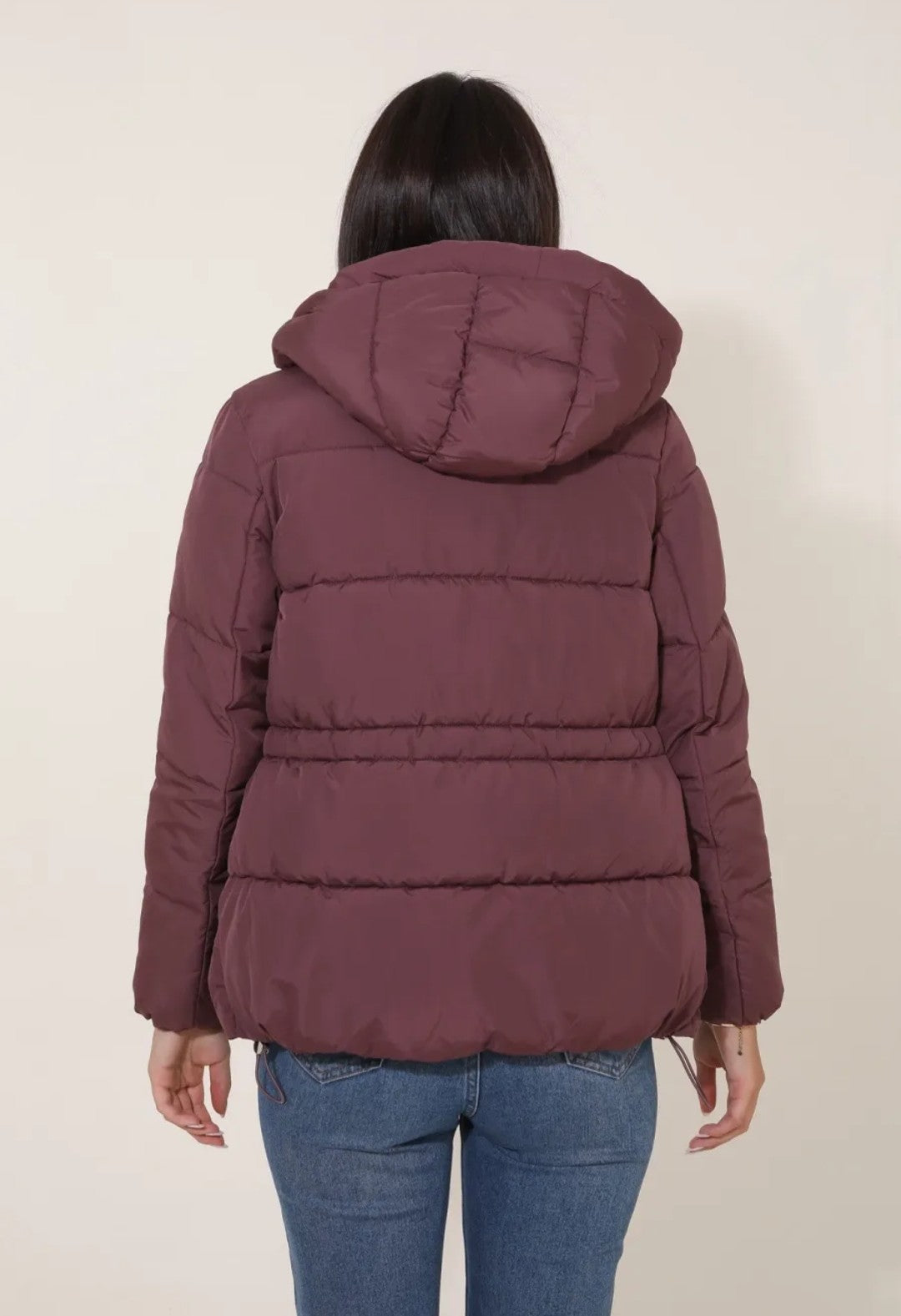 Ref. 8506 Anorac corto en color purpura, corte recto pero lleva cordón interior para entallar. Cierre con cremallera y botones a presión. 2 bolsillos con cremallera. Capucha extraible.