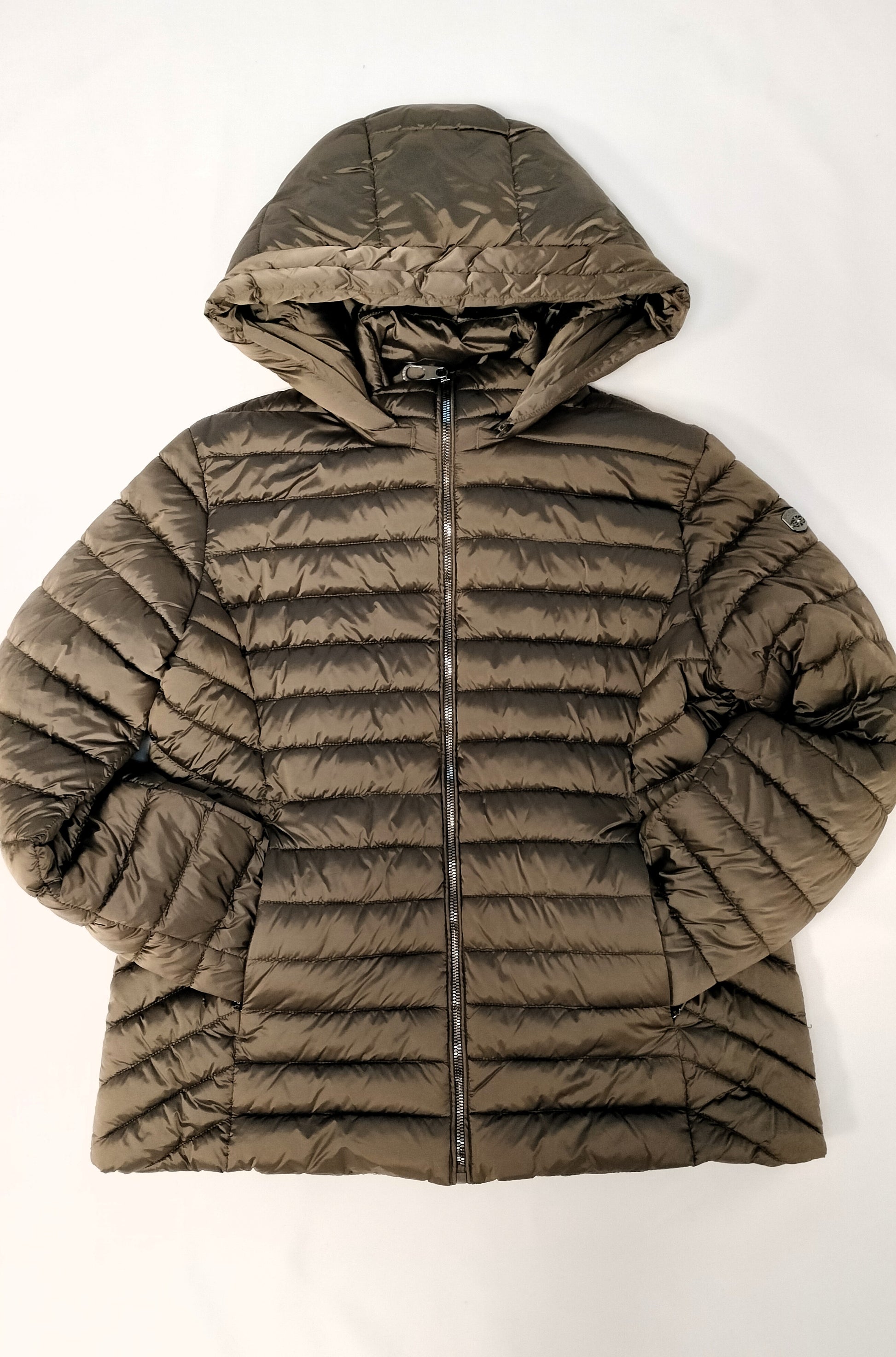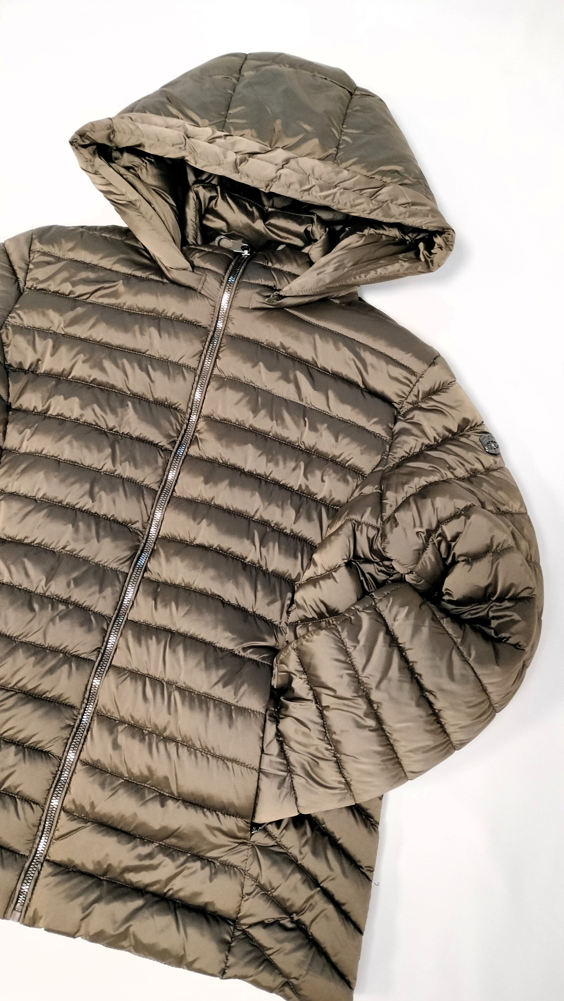 Ref. JR Katrine Anorac corto, acolchado, super suave y ligero y muy cálido, corte ligeramente entallado, capucha extraíble, cierre con cremallera, bolsillos con cremallera invisible. Color marron