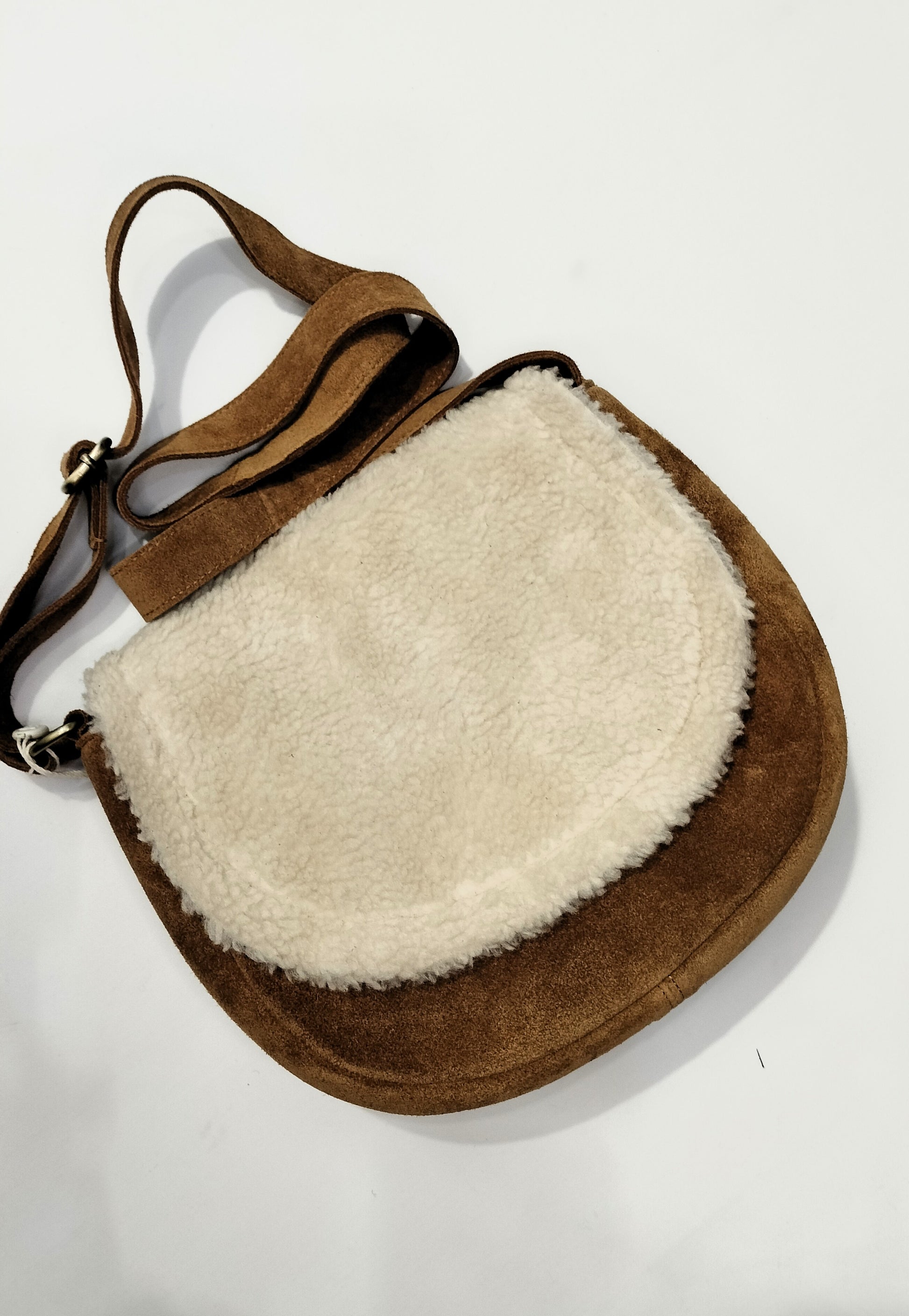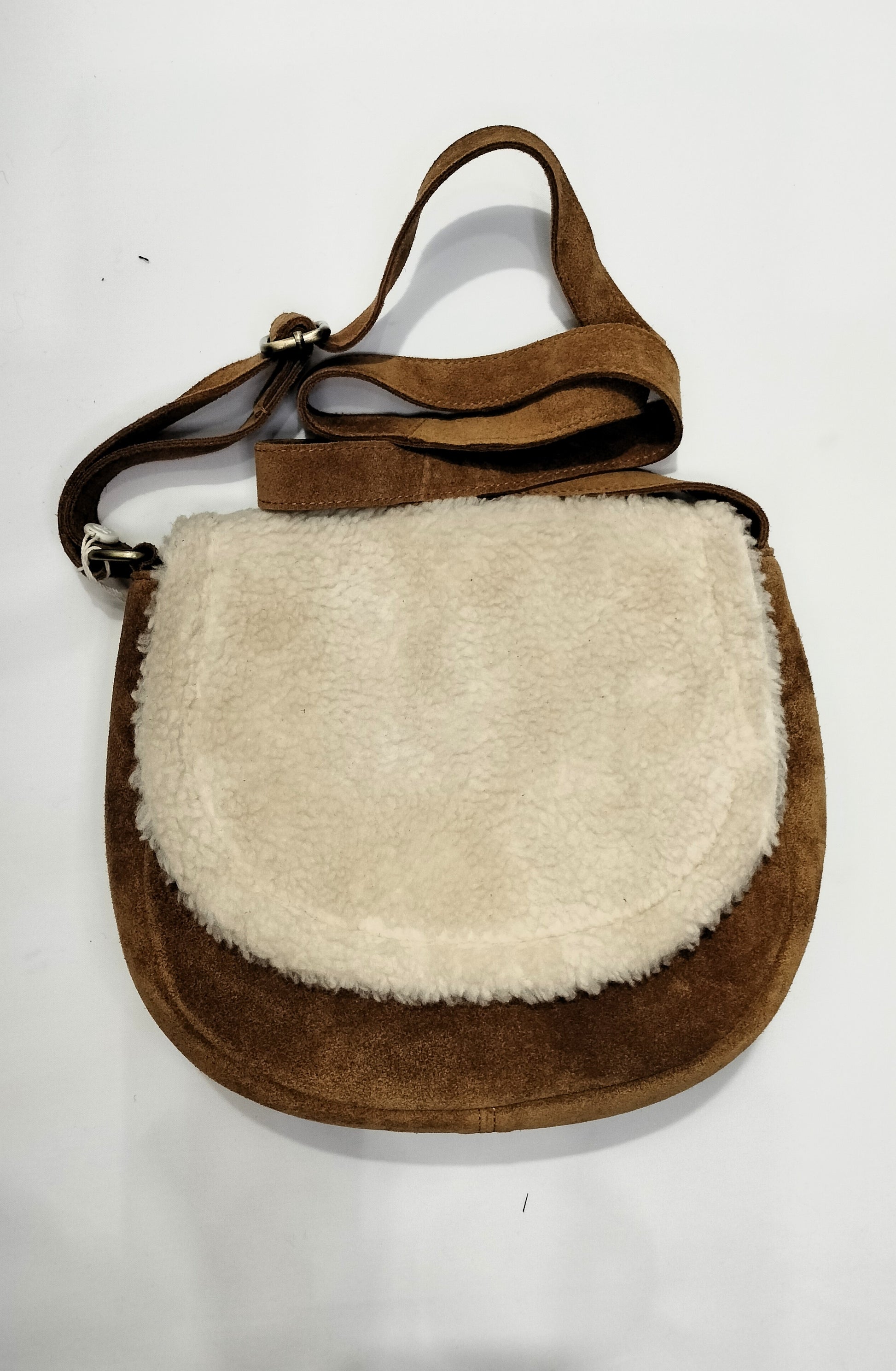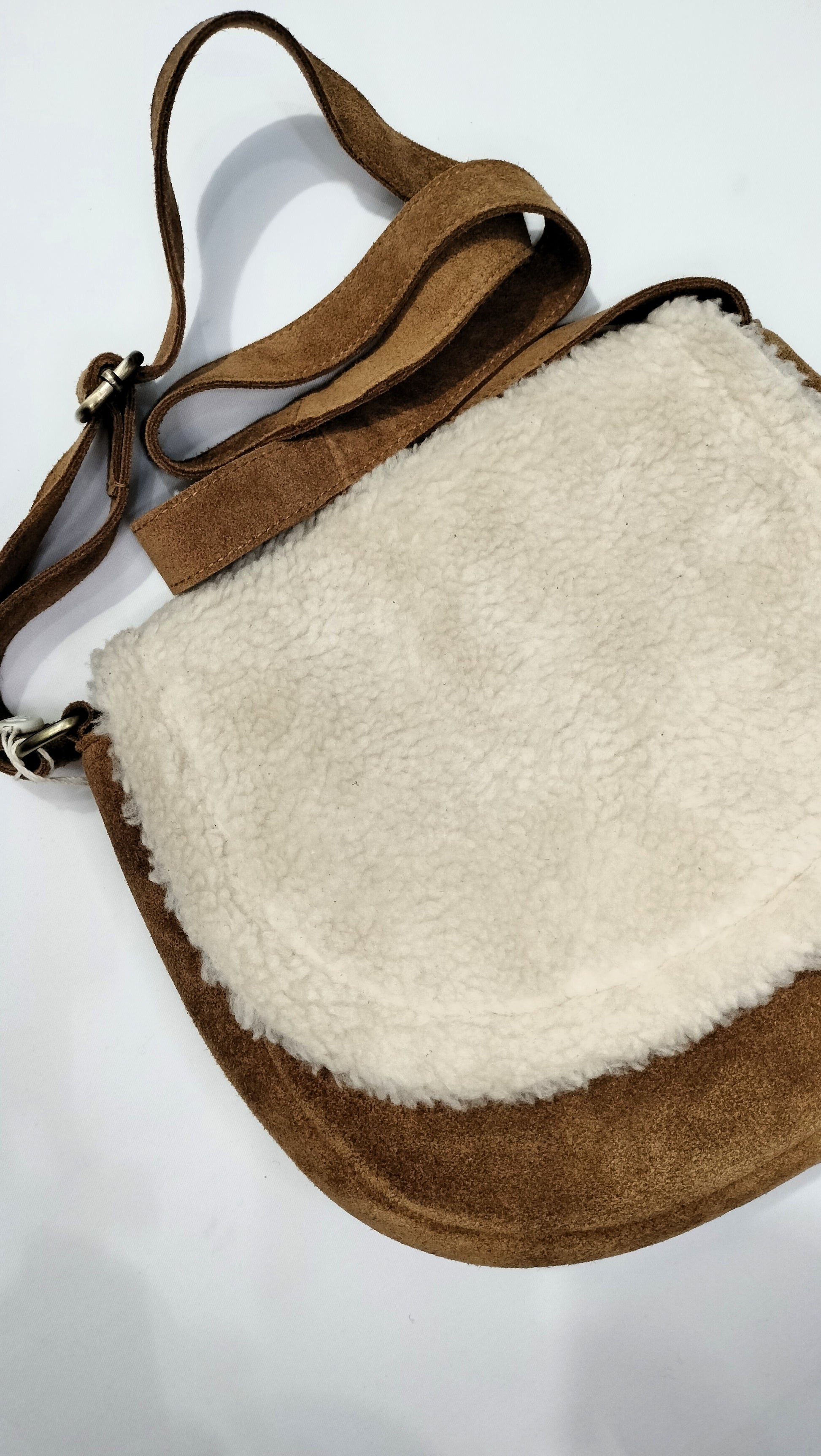 Ref. JR VI23MM831 Bolso tipo bandolera de piel girada con solapa tipo borreguito en color blanco roto. Correa larga de piel girada