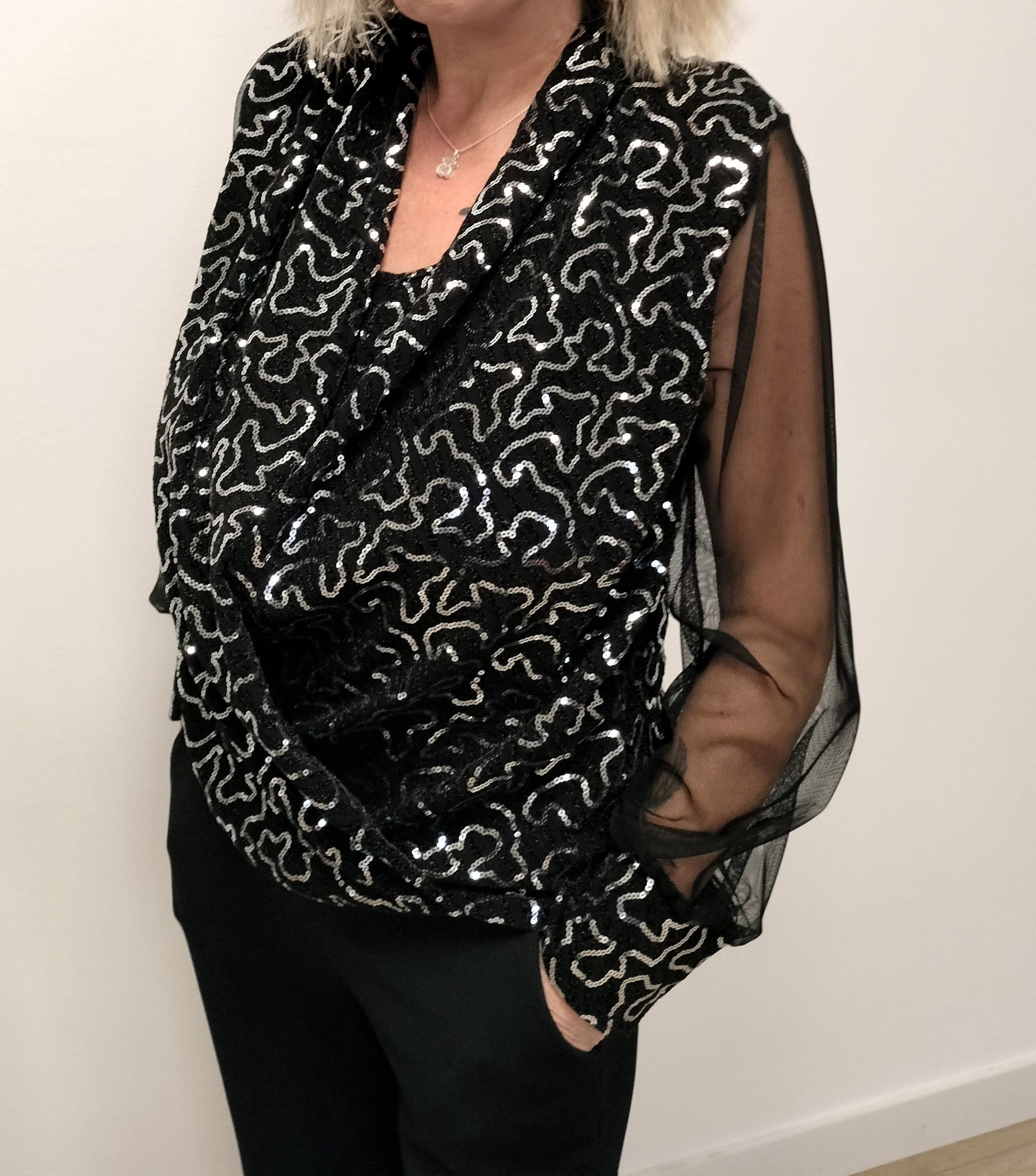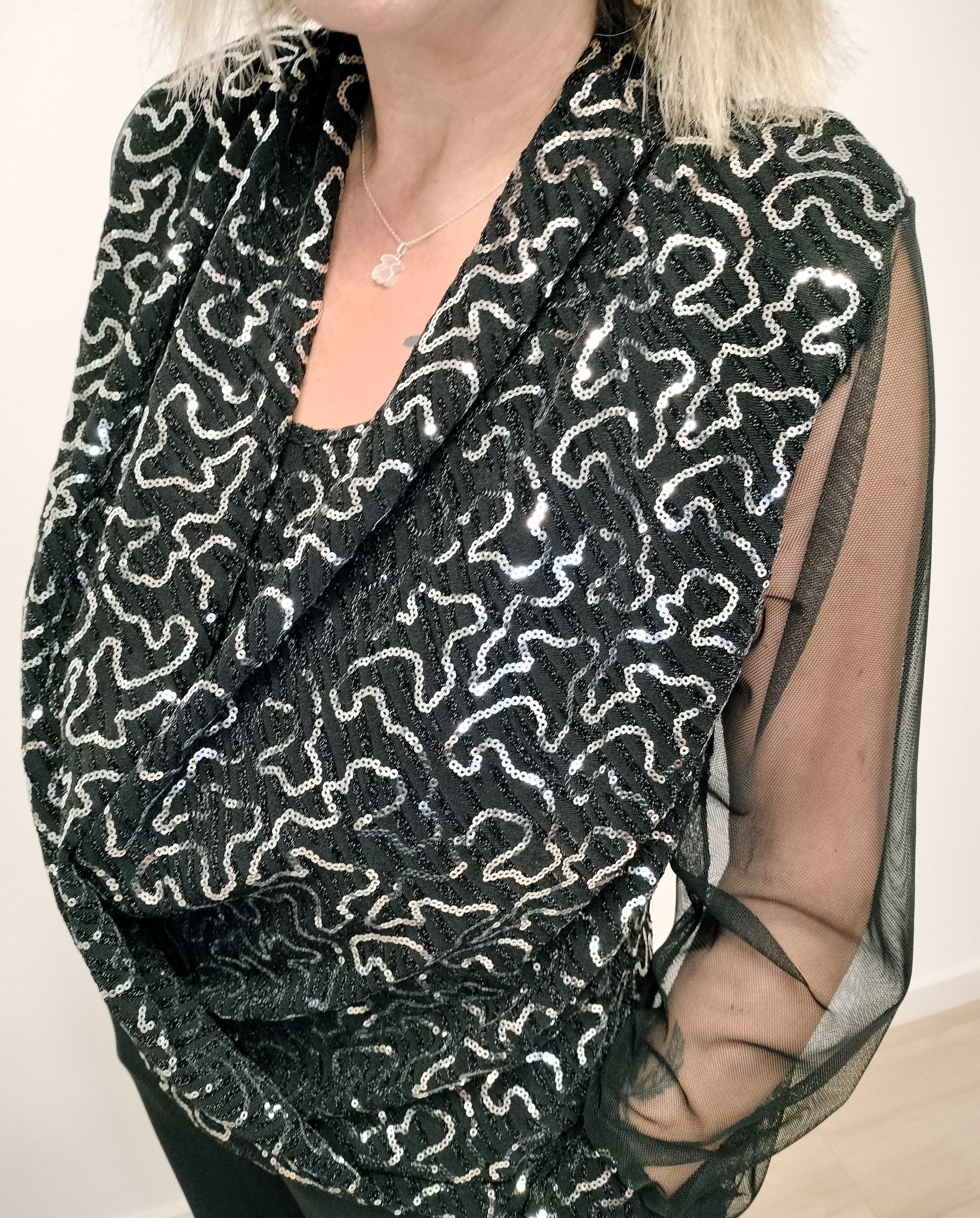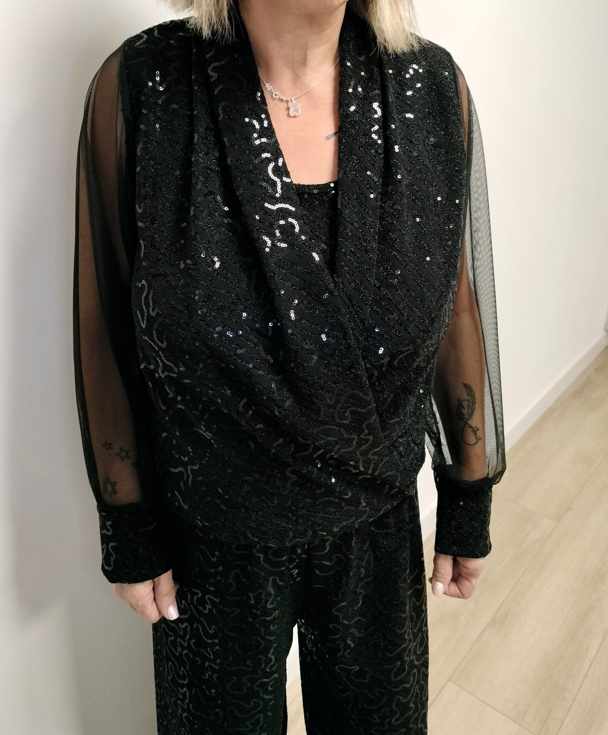 Ref. 2050 Blusa fiesta cruzada con lentejuelas y mangas de tul transparentes.