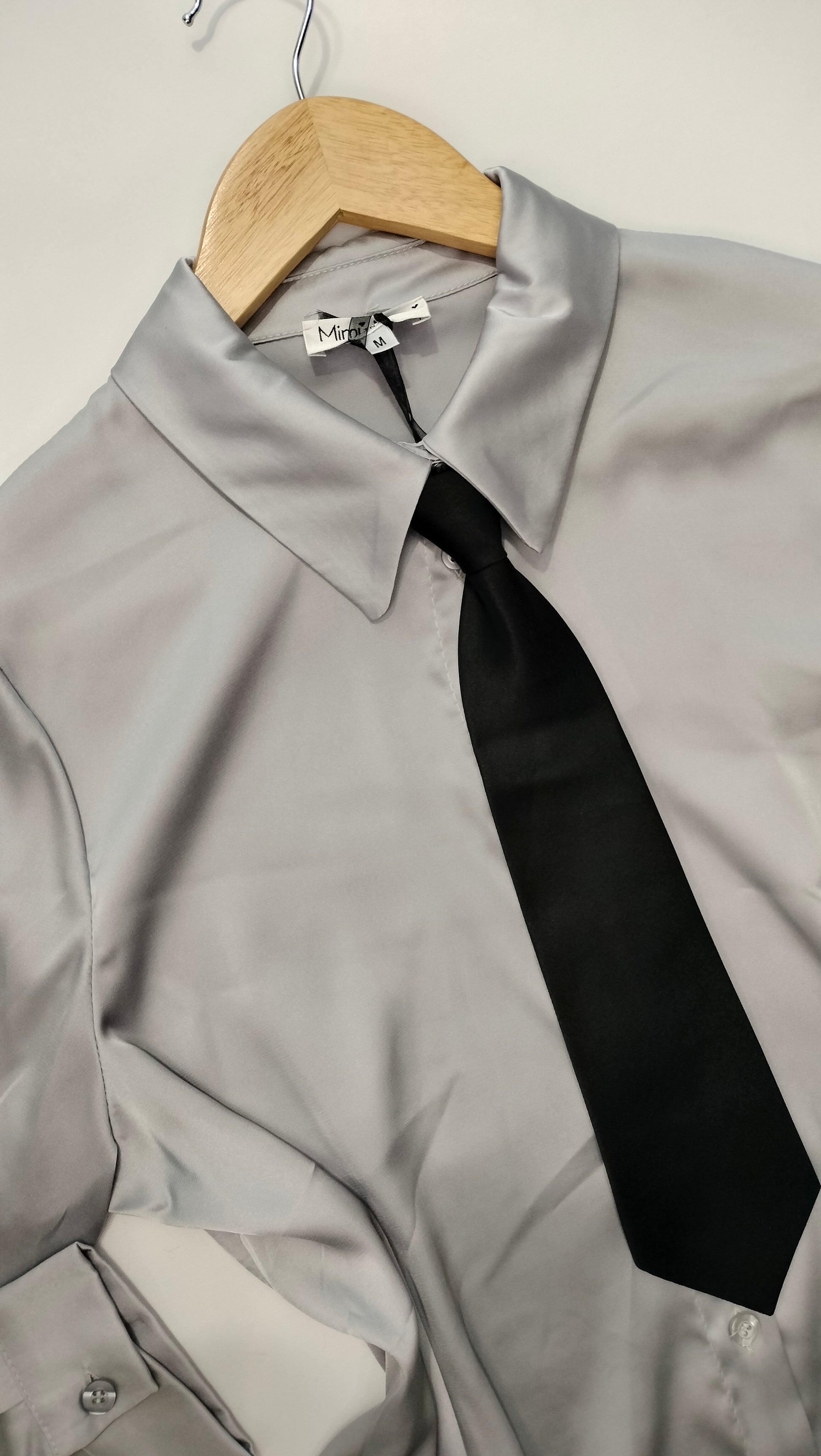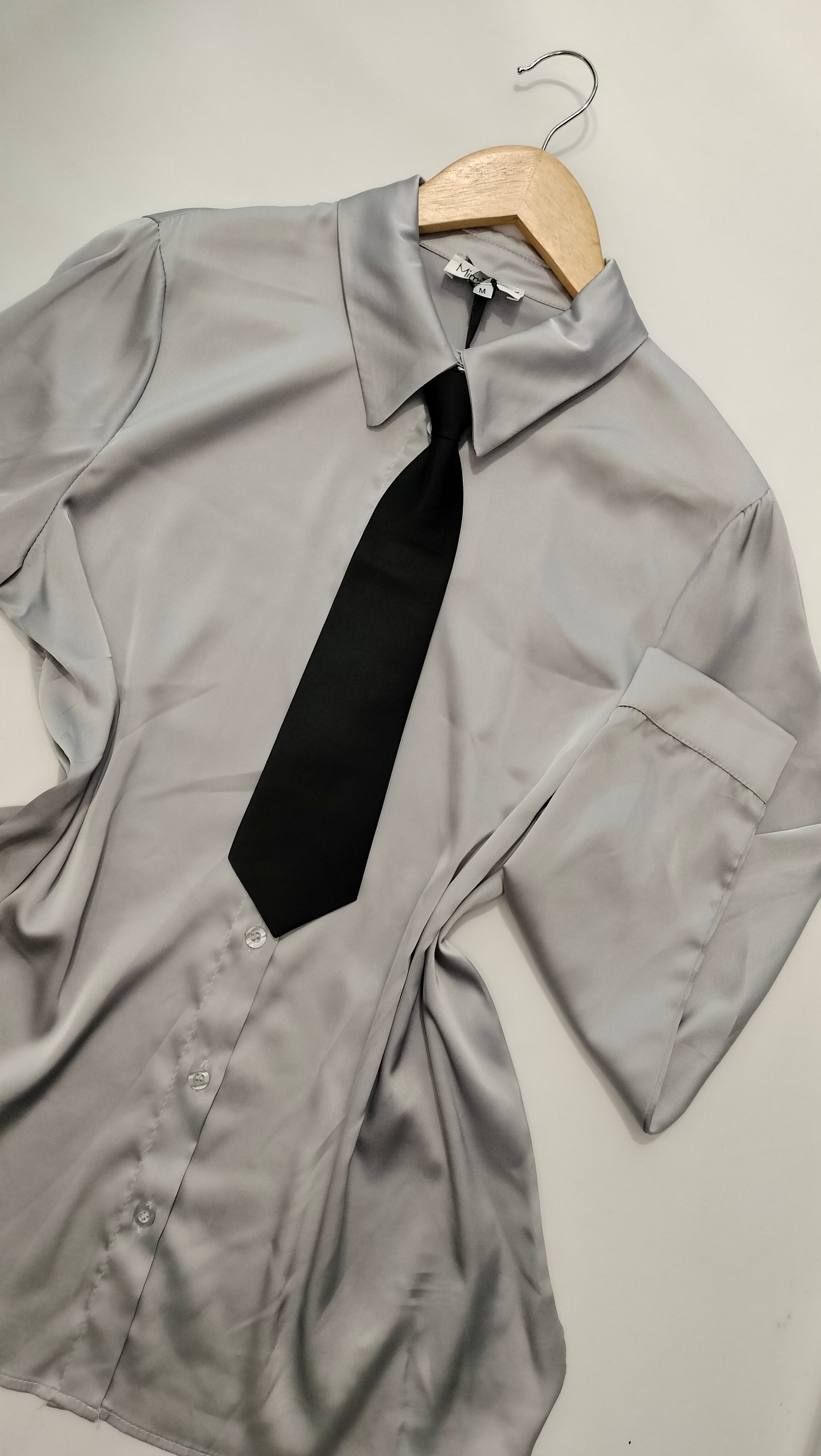 Ref. JR 1754 Camisa de satén en color gris, manga larga, puño con botón, cierre con botones, cuello de camisa, corte recto, detalle corbata incluido