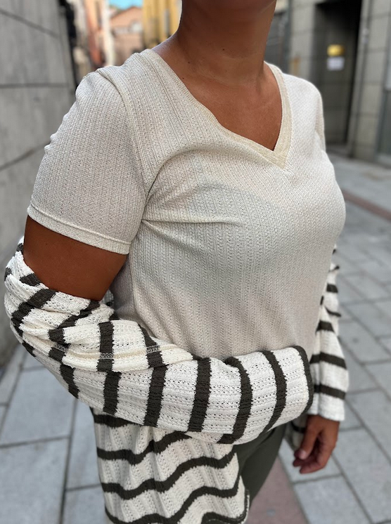 Ref. 37716 Camiseta manga corta en beige y oro, escote tipo V, corte entallado. Talla única: pecho 50 cms