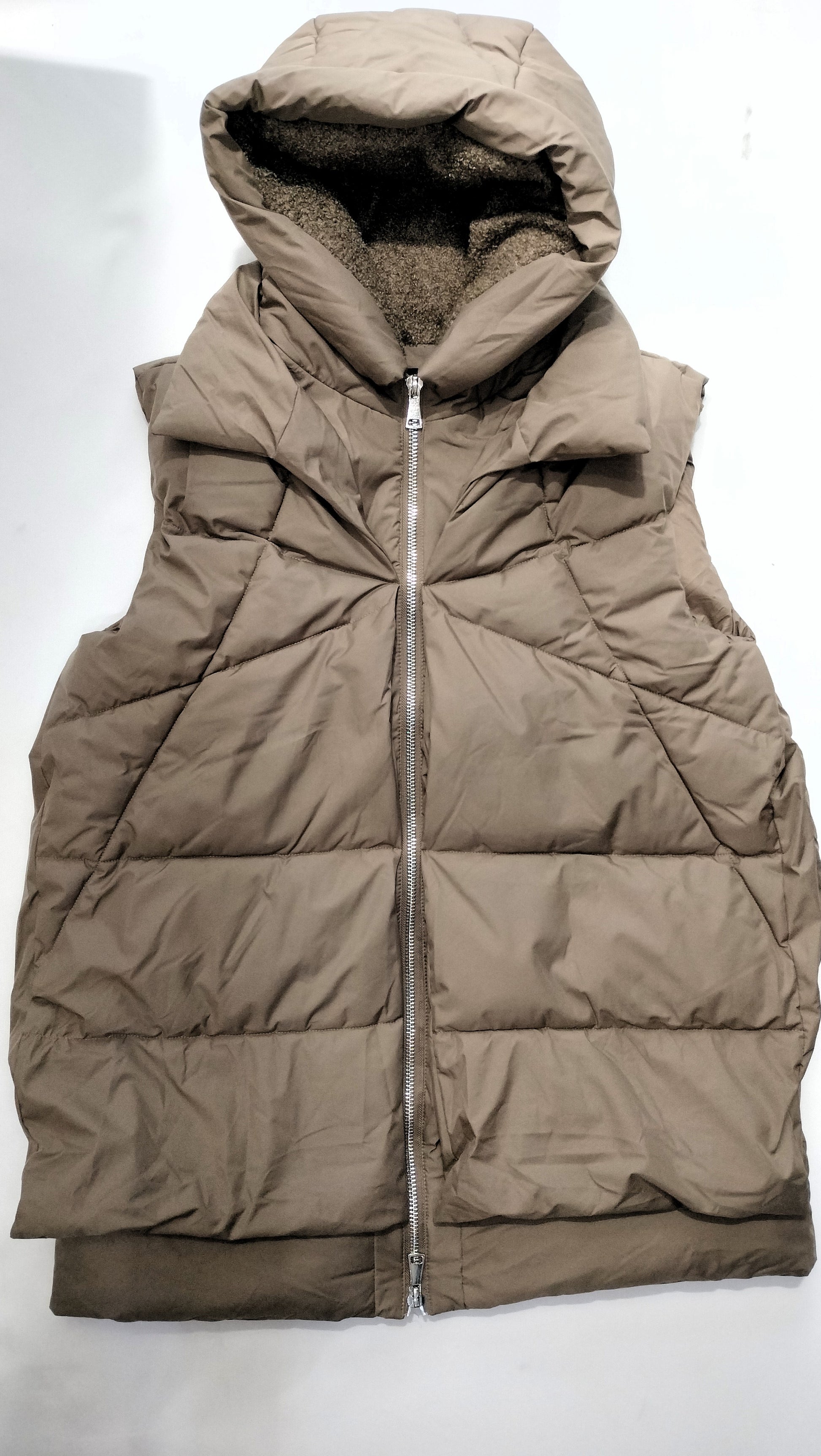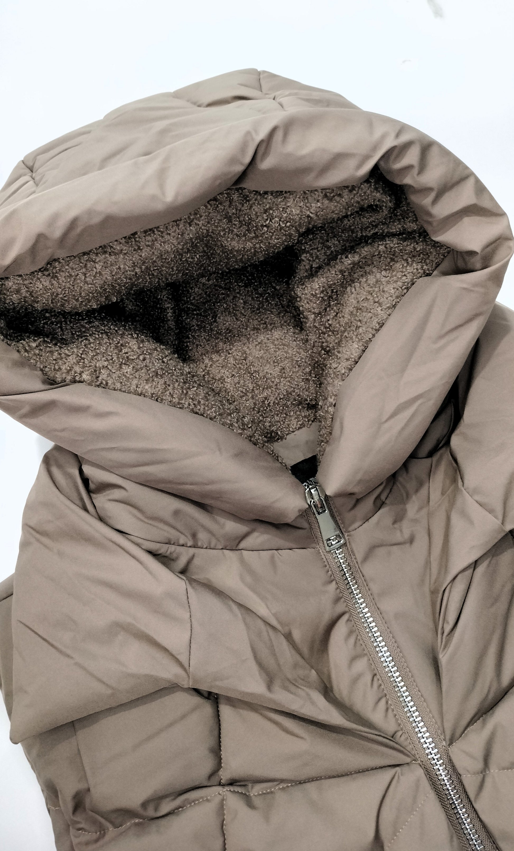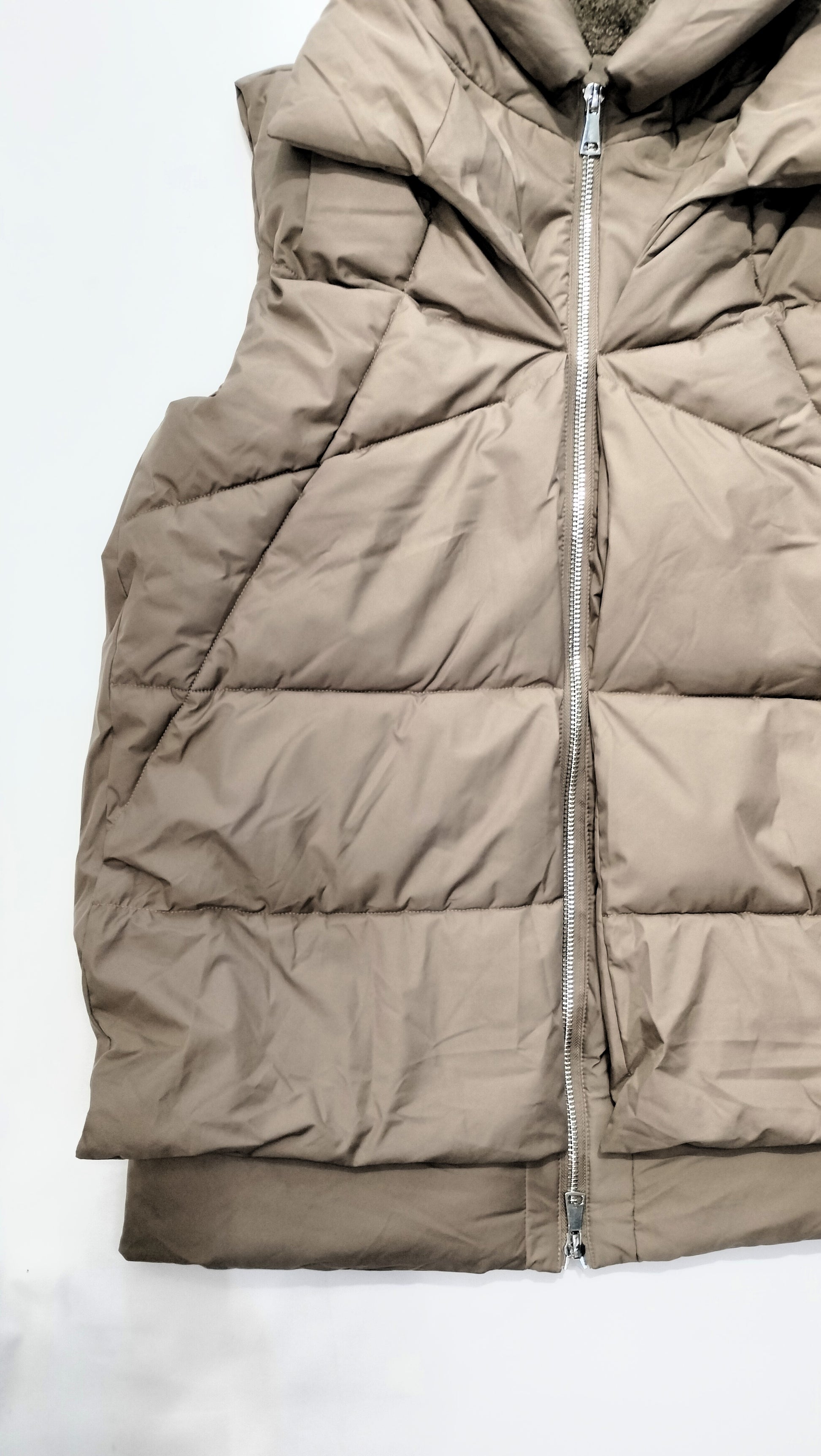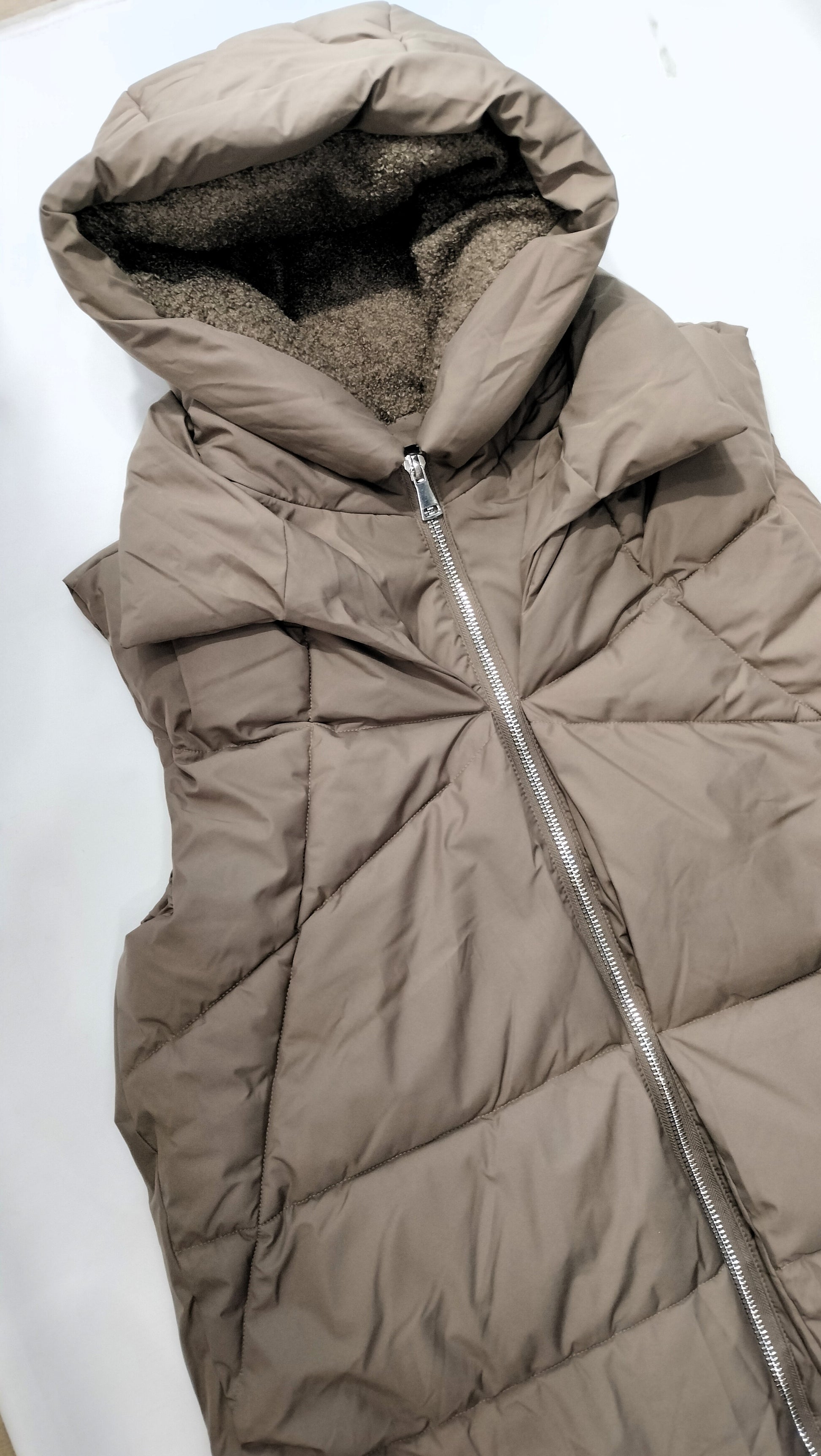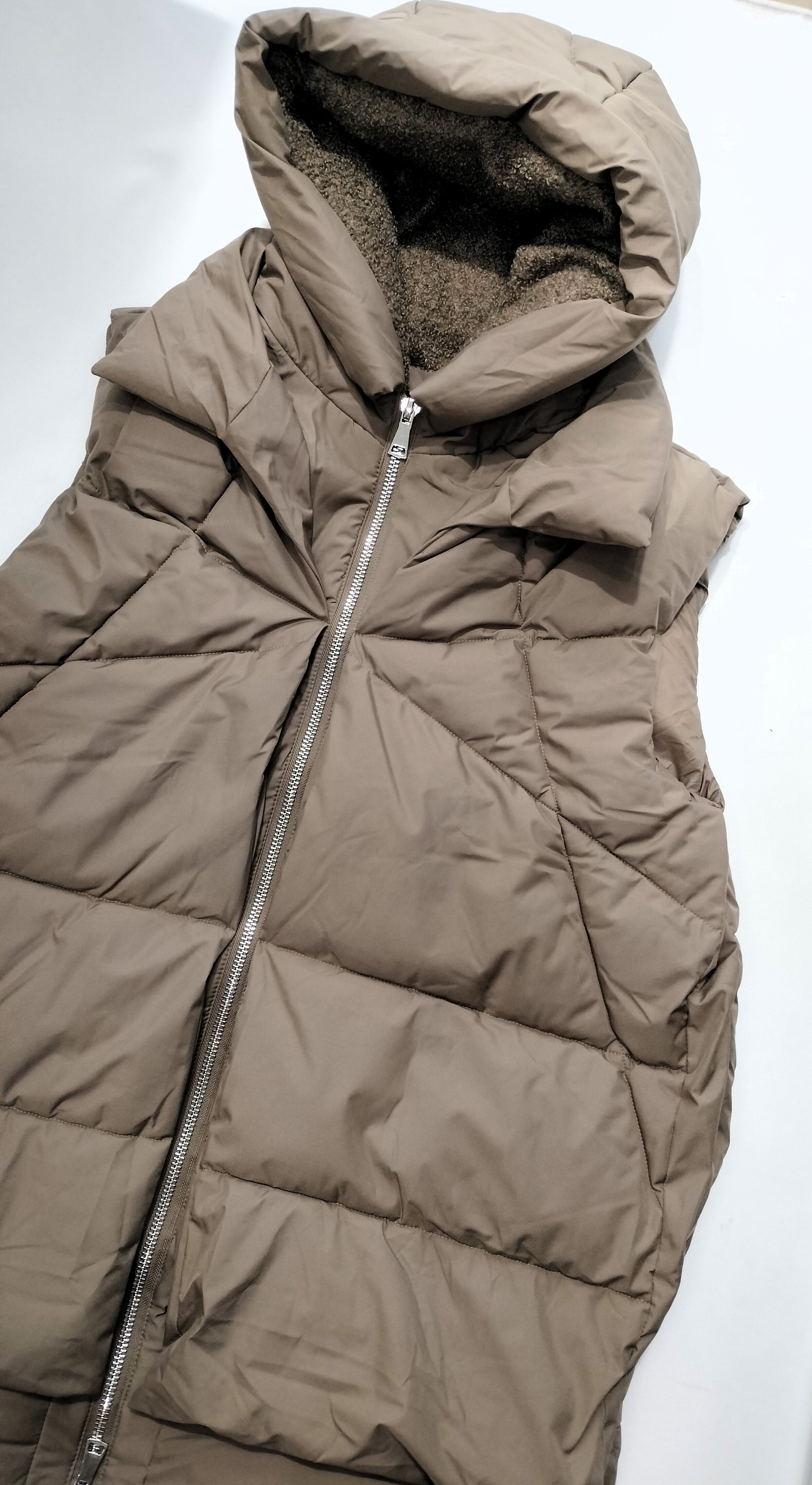 Ref. JR COF-2111043 Chaleco sin mangas largo y acolchado grueso, cierre con cremallera, color tostado, capucha fija y con interior de borreguito, 2 bolsillos