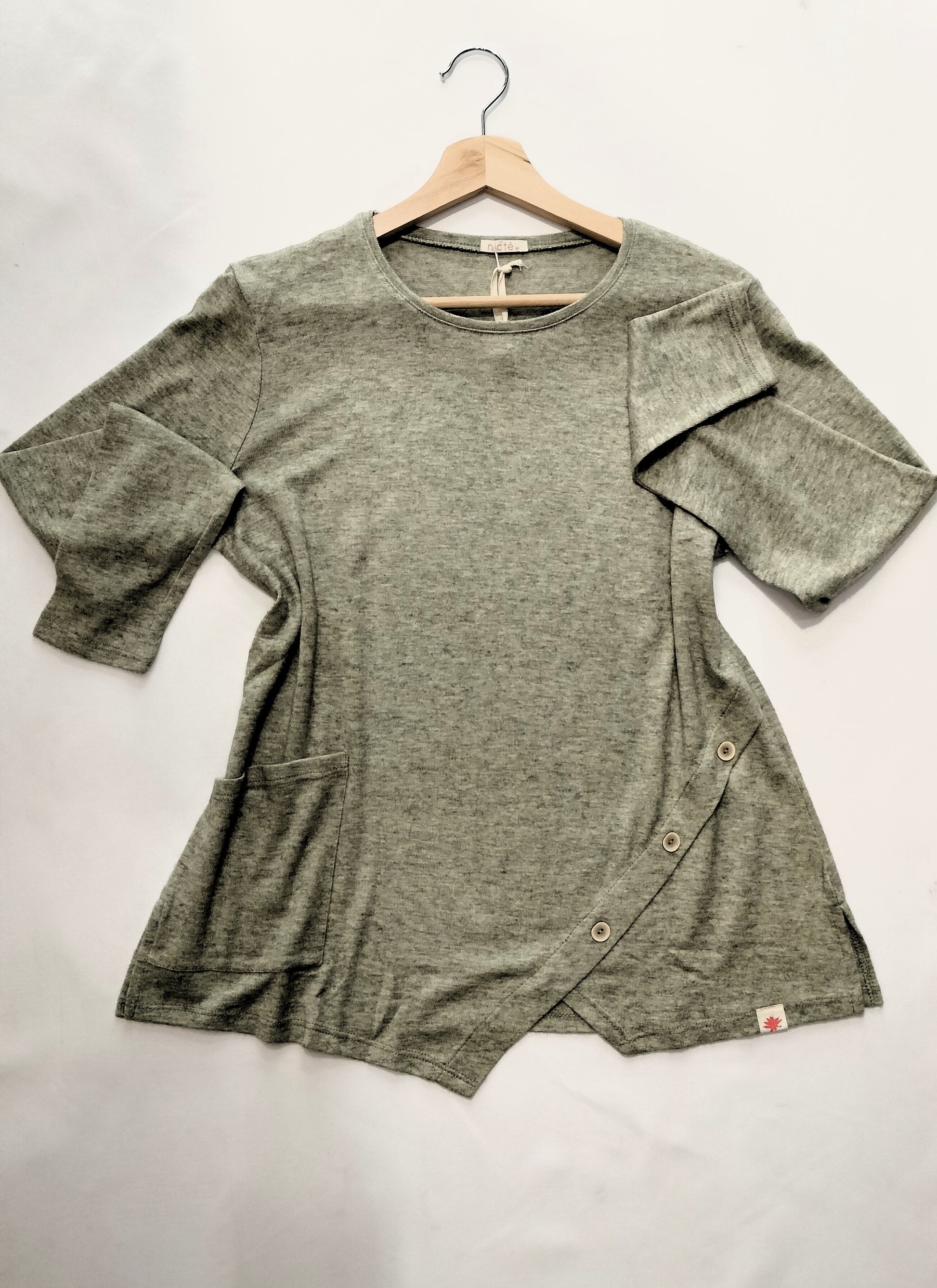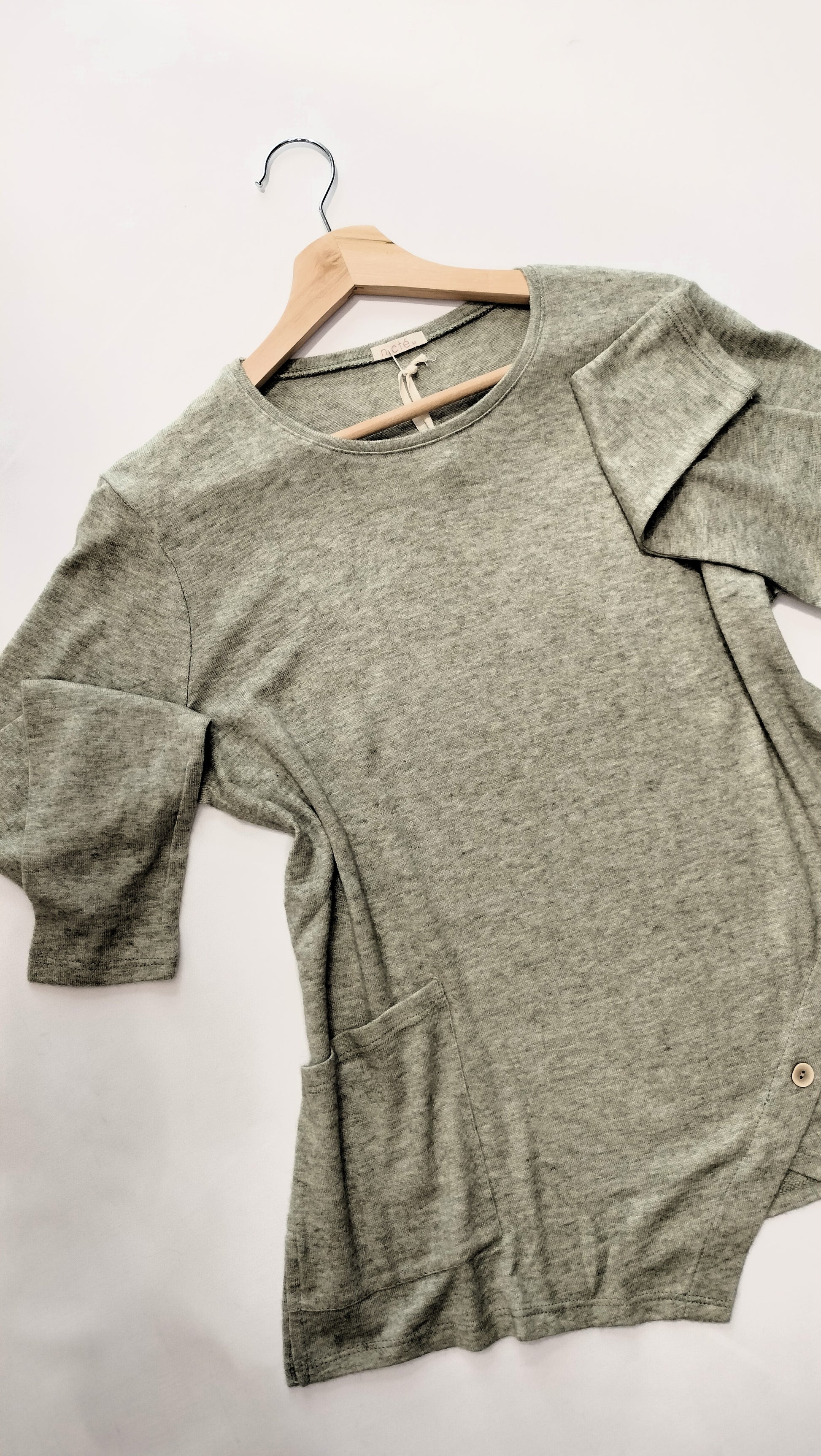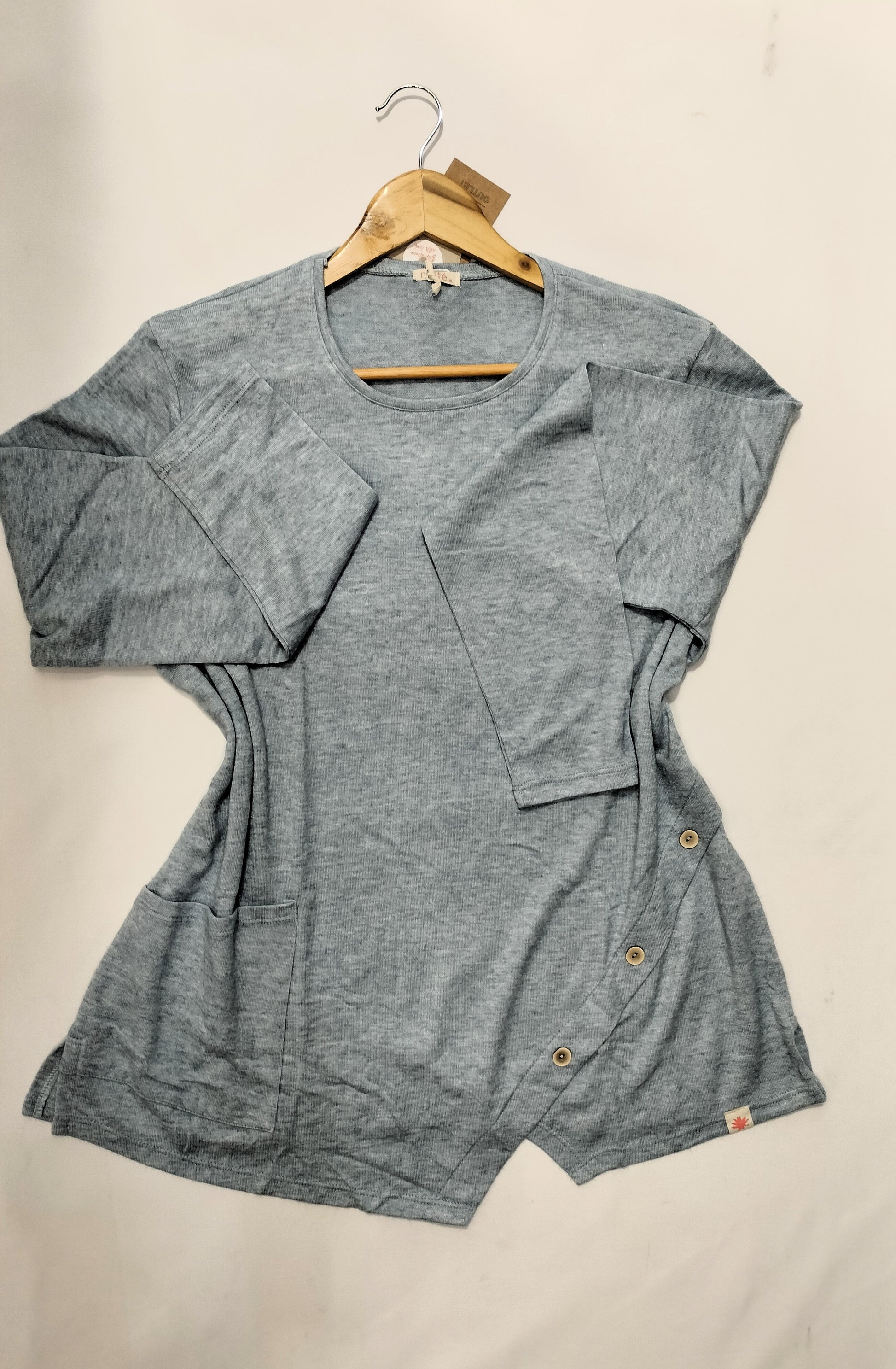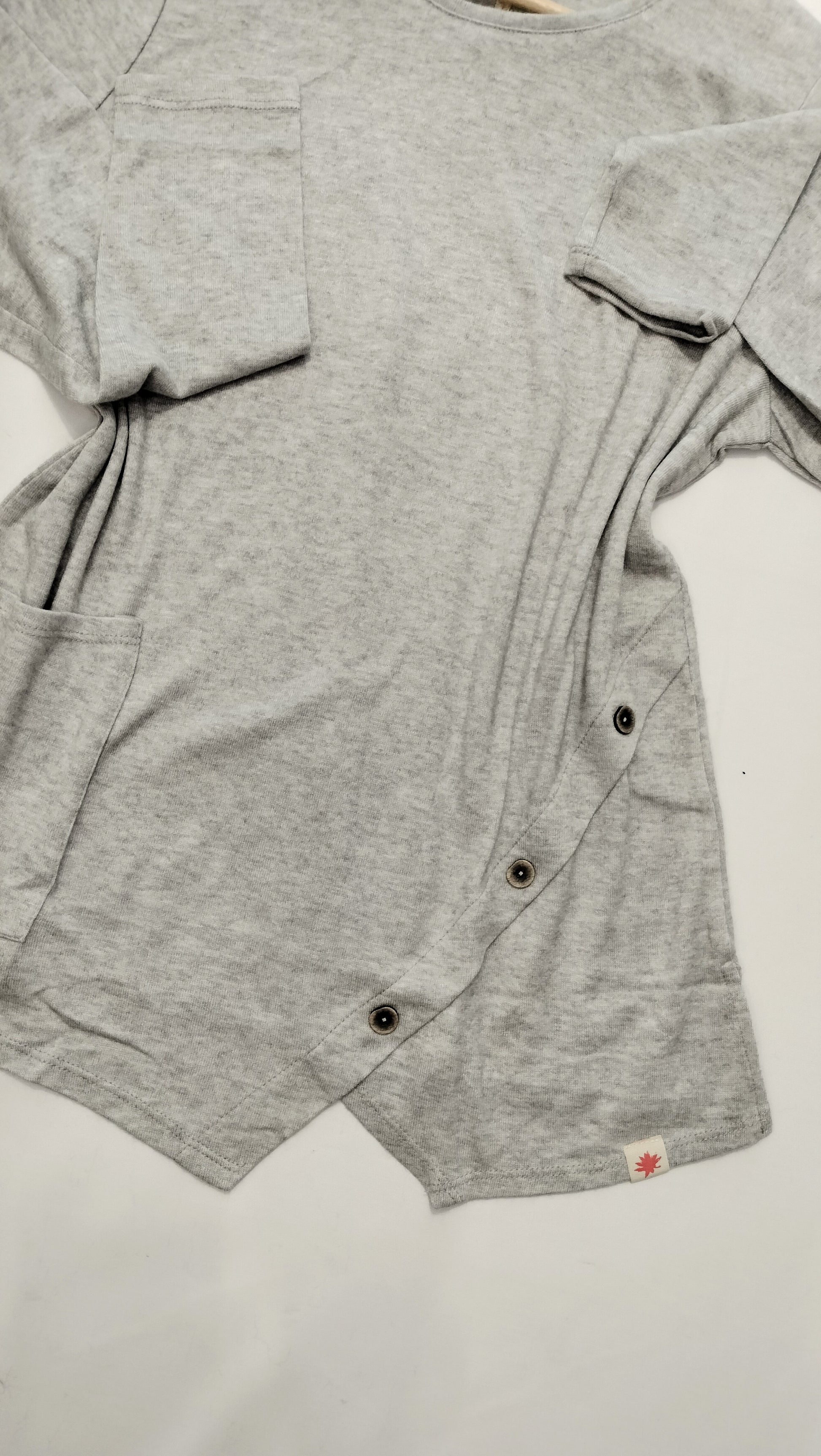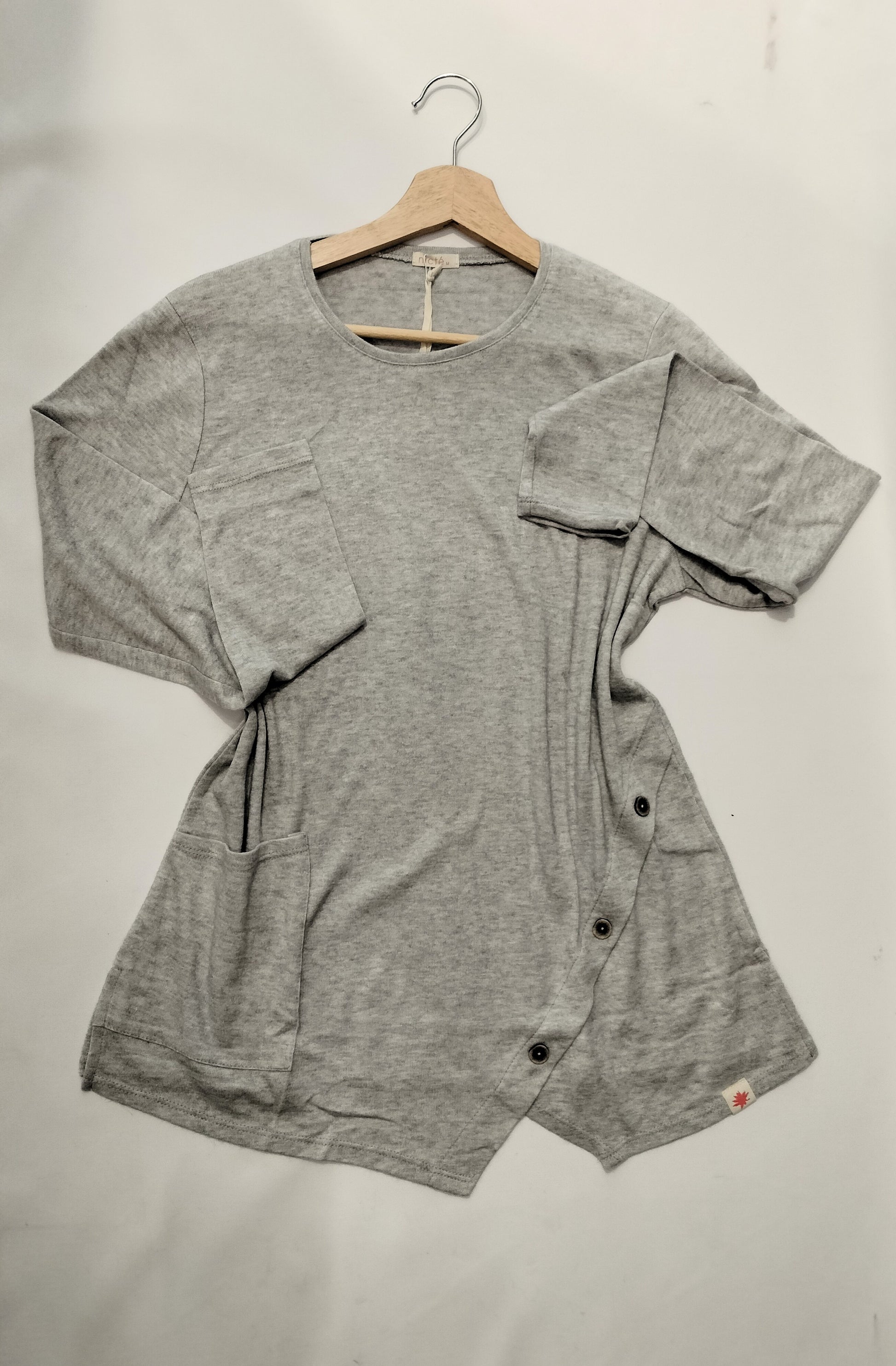 Ref. JR 6280 Jersey fino de manga larga, cuello redondo, bajo delantero asimétrico, 1 bolsillo, detalle botones decorativos
