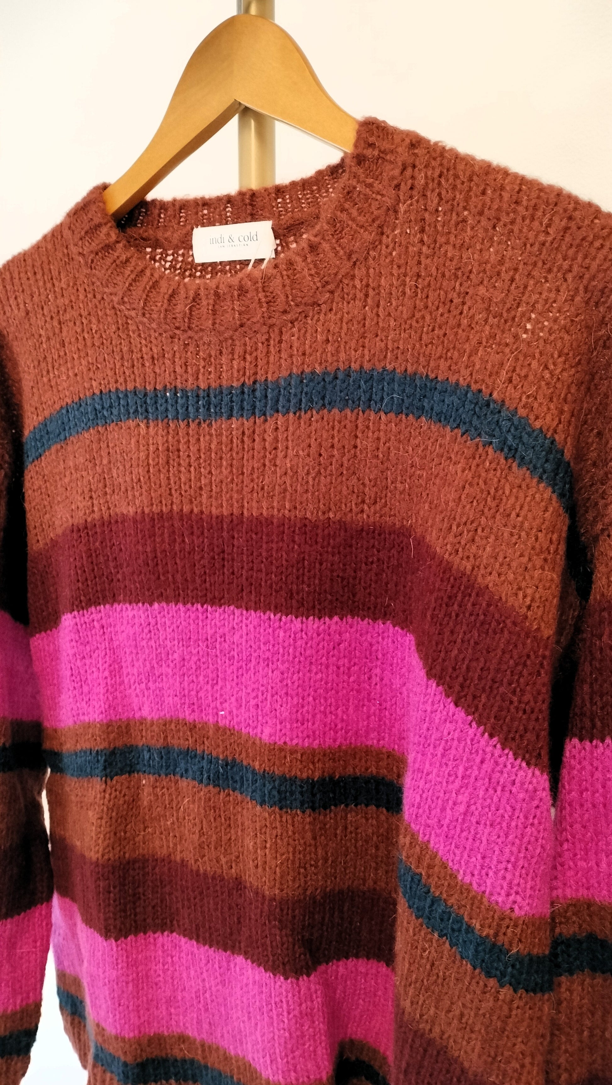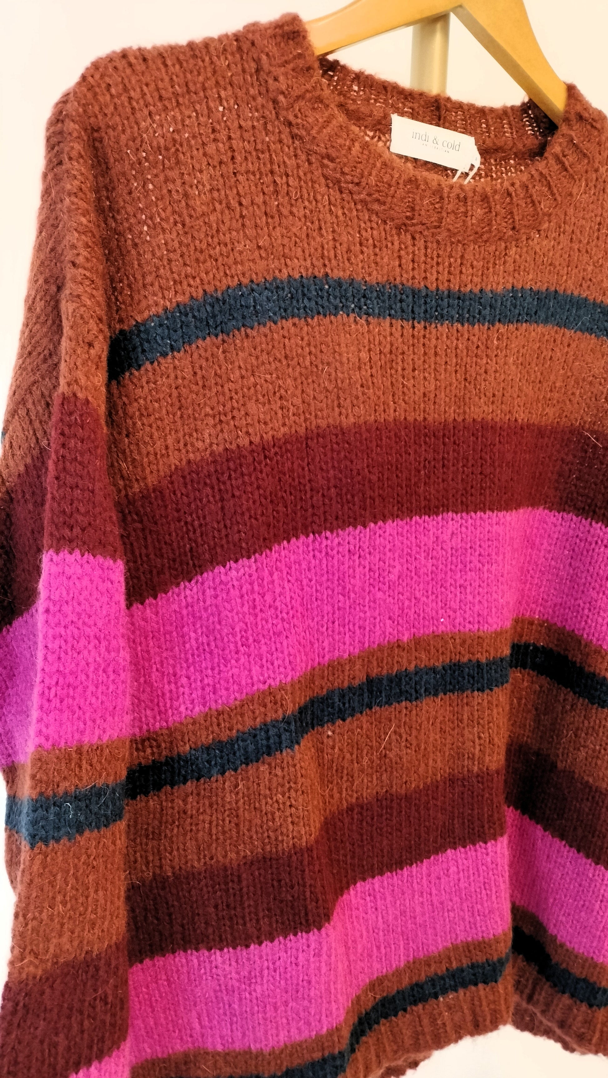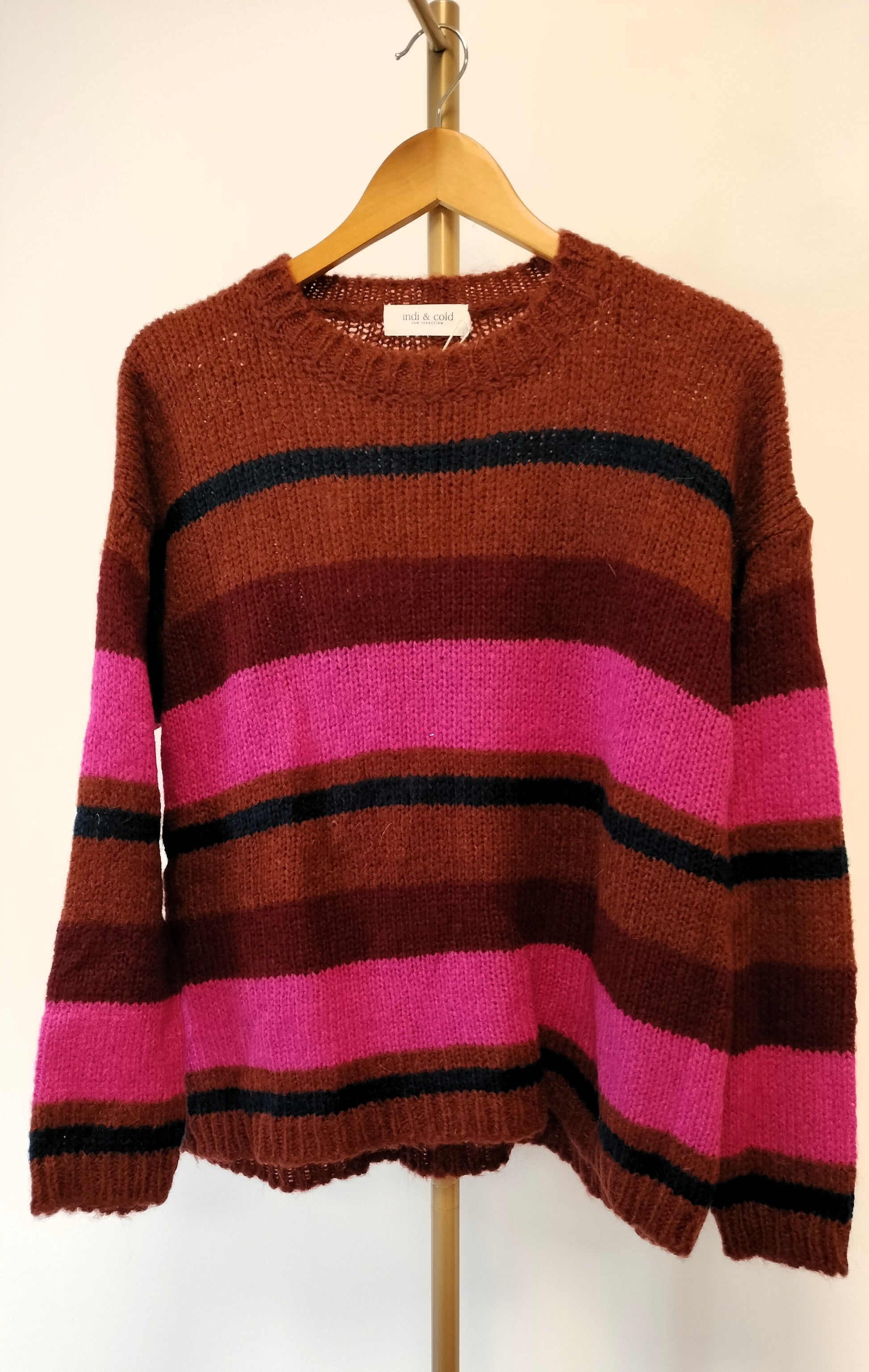 Ref. JR VI23EA655 Jersey de punto grueso, manga larga, cuello redondo, corte recto, estampado rayas horizontales en rosa, granate y narrón