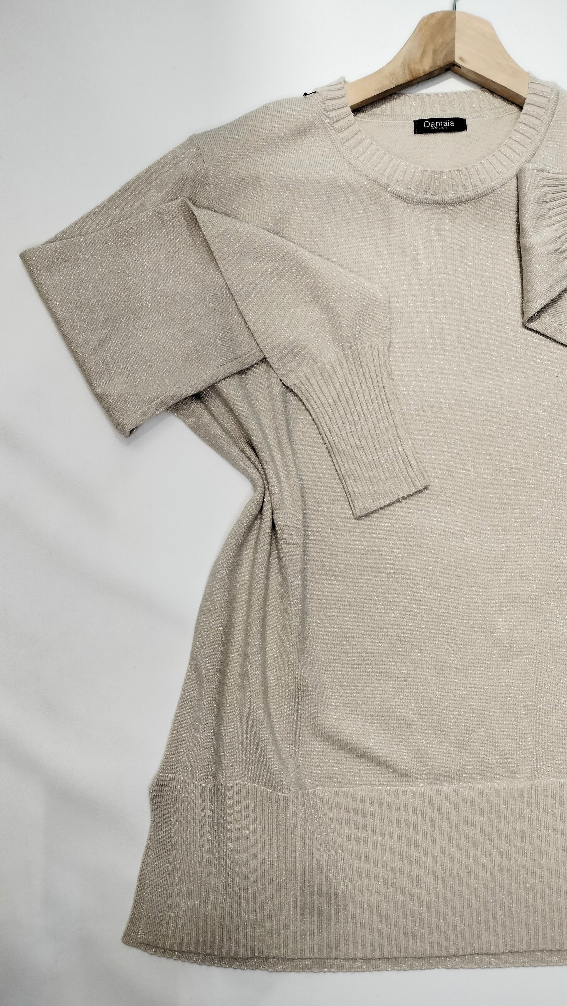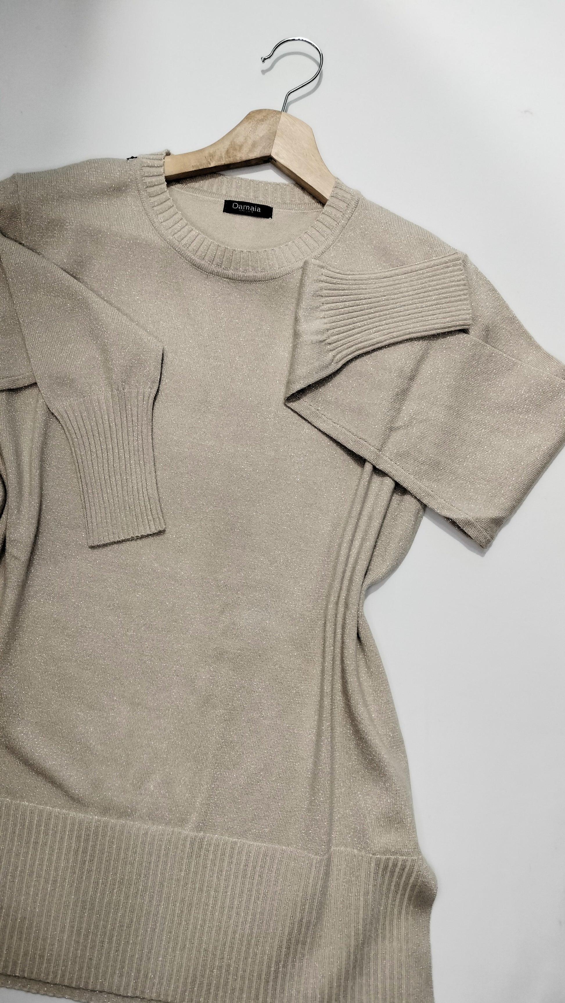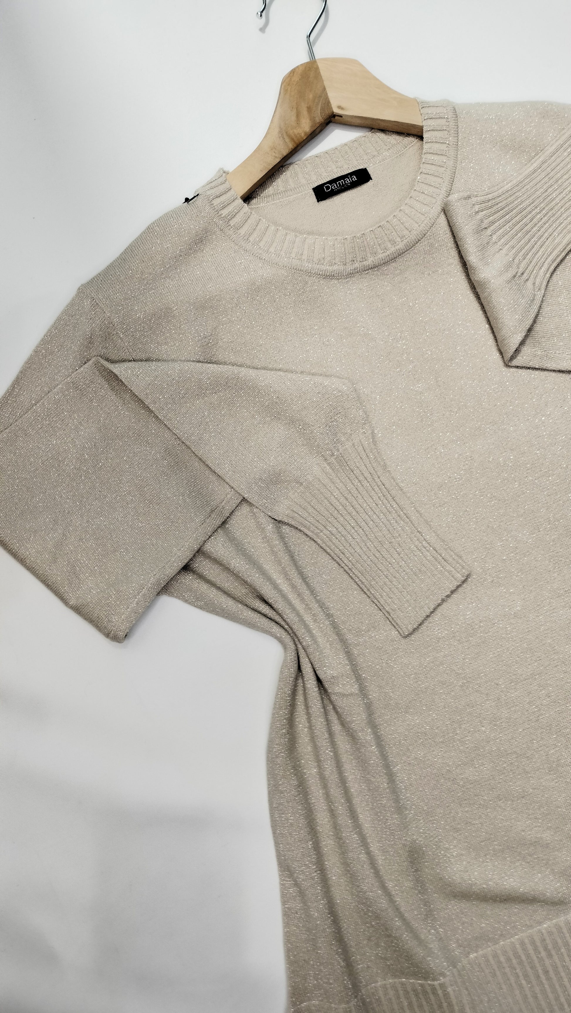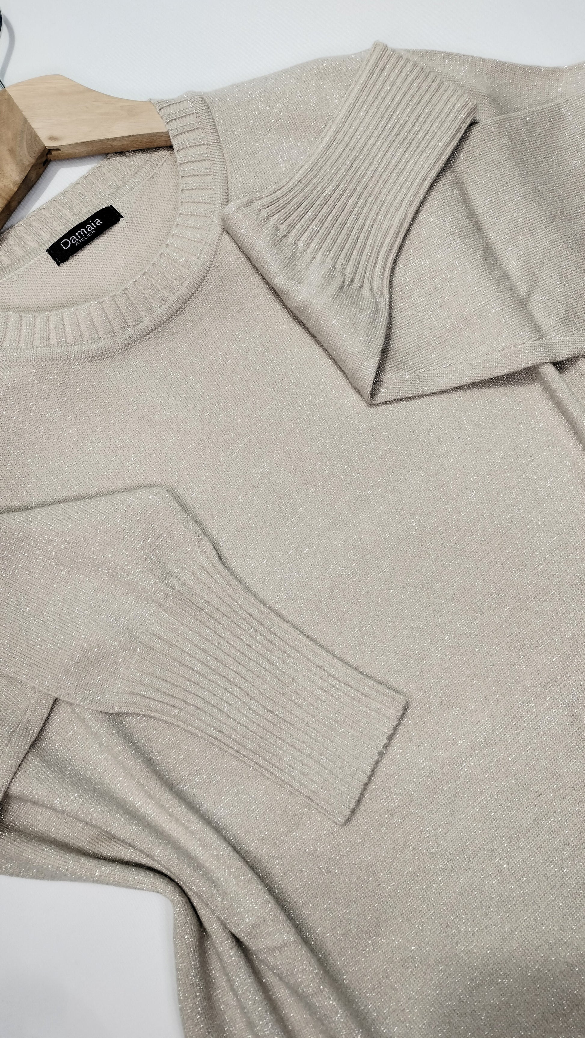 Ref. JR 224097 Jersey de punto fino en color crema con brillo lurex, corte recto, largo con aperturas laterales, cuello redondo, puño más estrecho