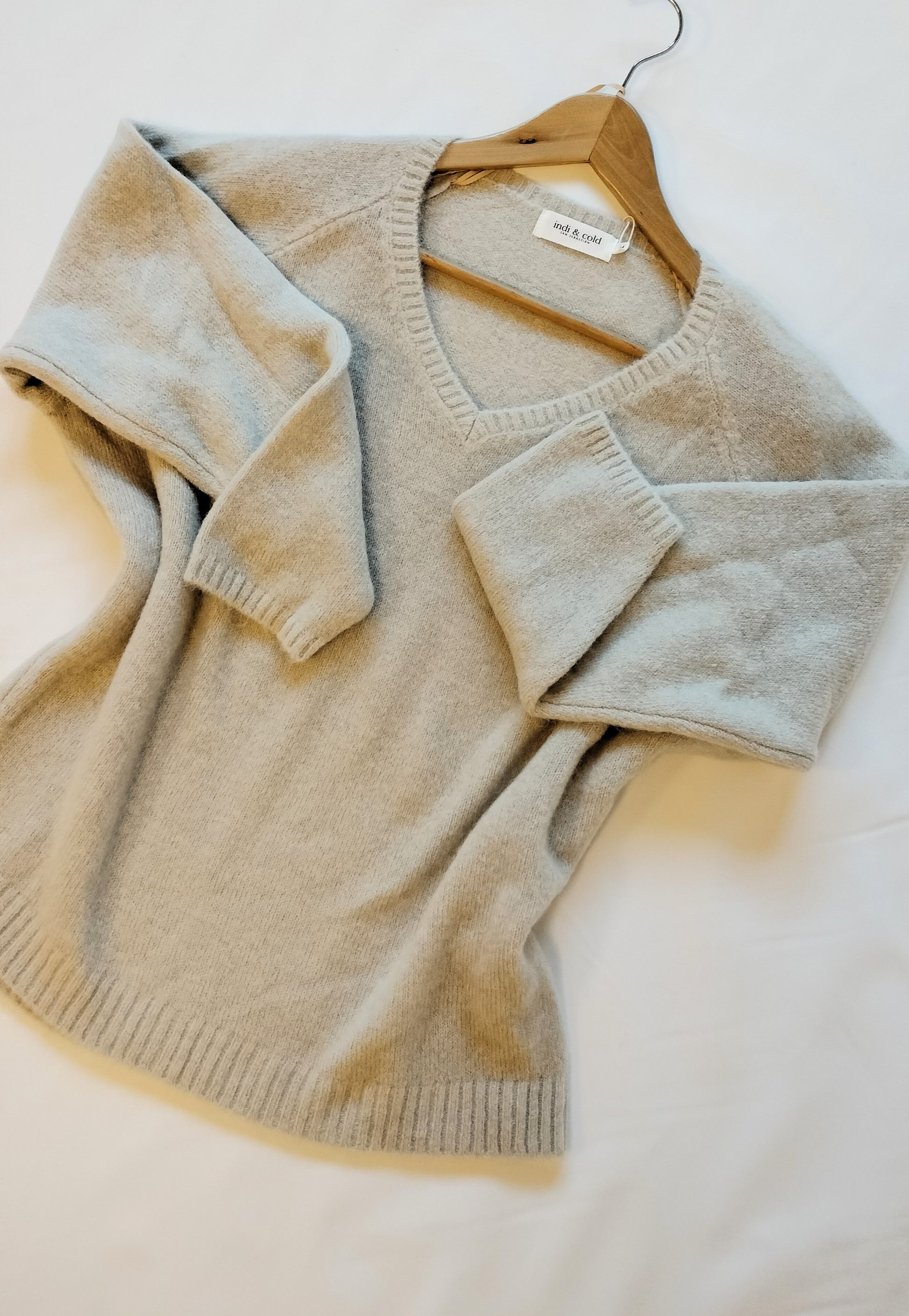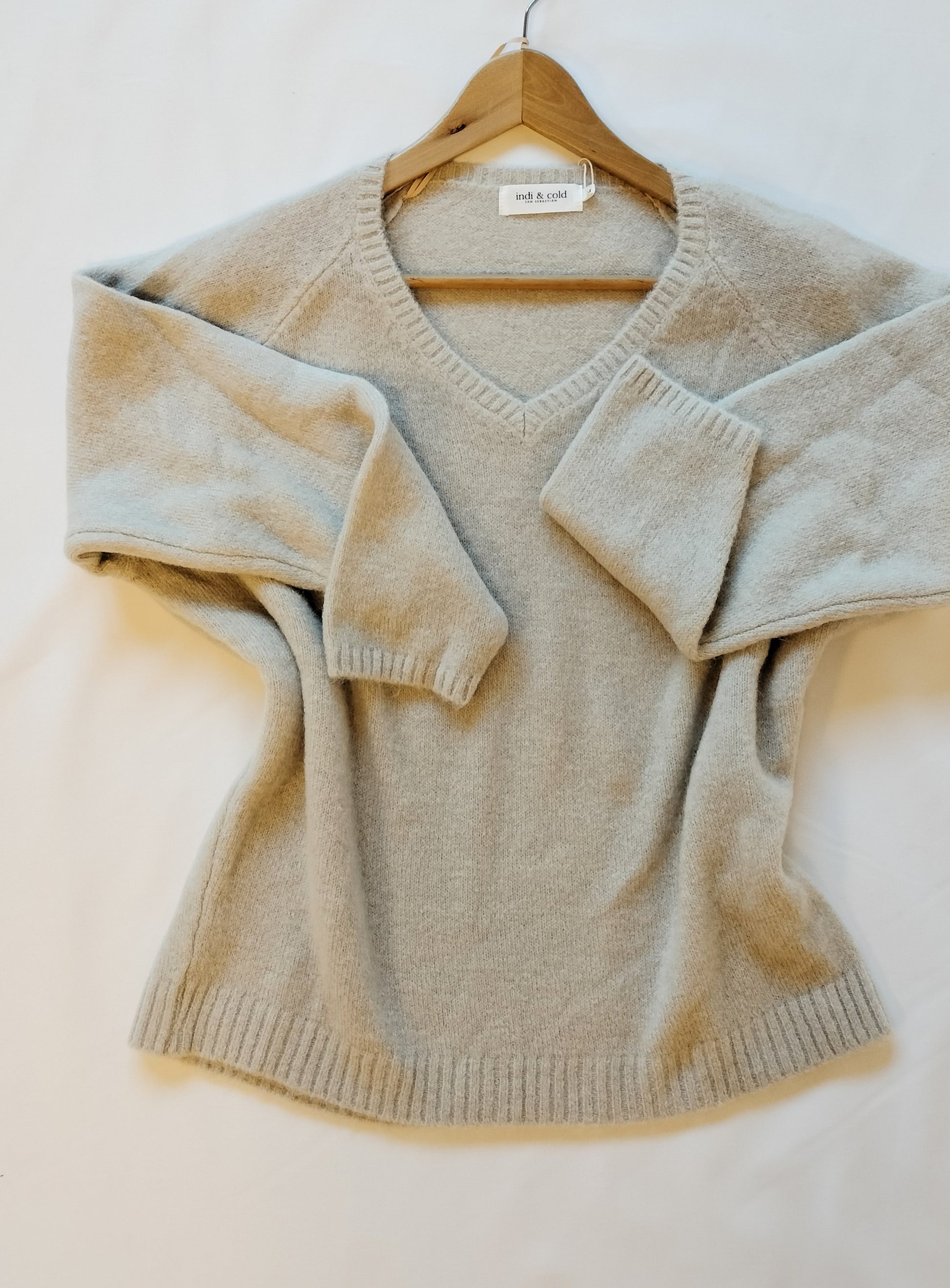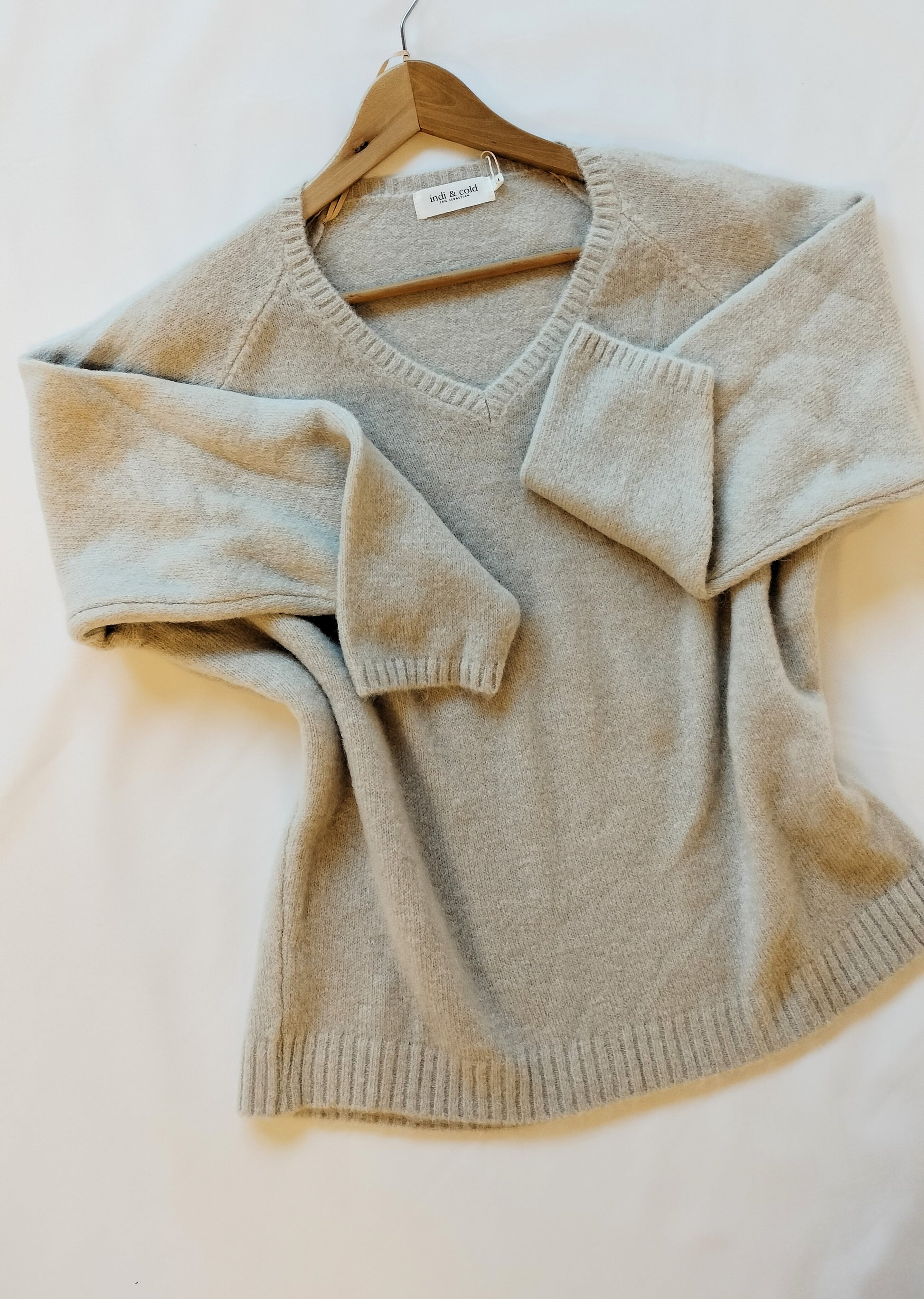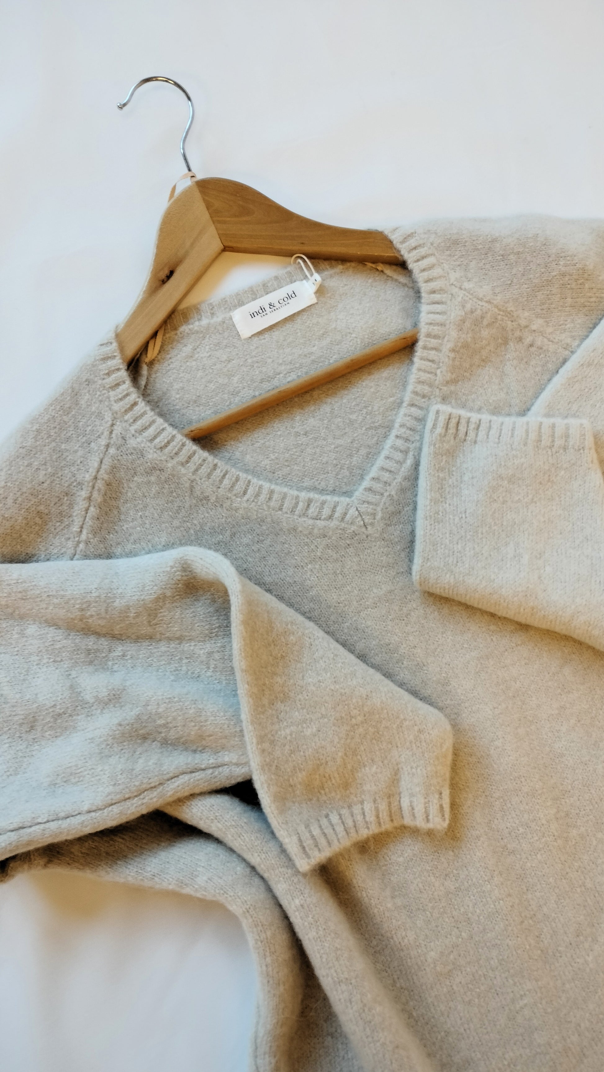 Ref. JR VI23FG481 Jersey de punto grueso super suave, color beige, escote tipo V, manga larga, corte entallado. Talla M