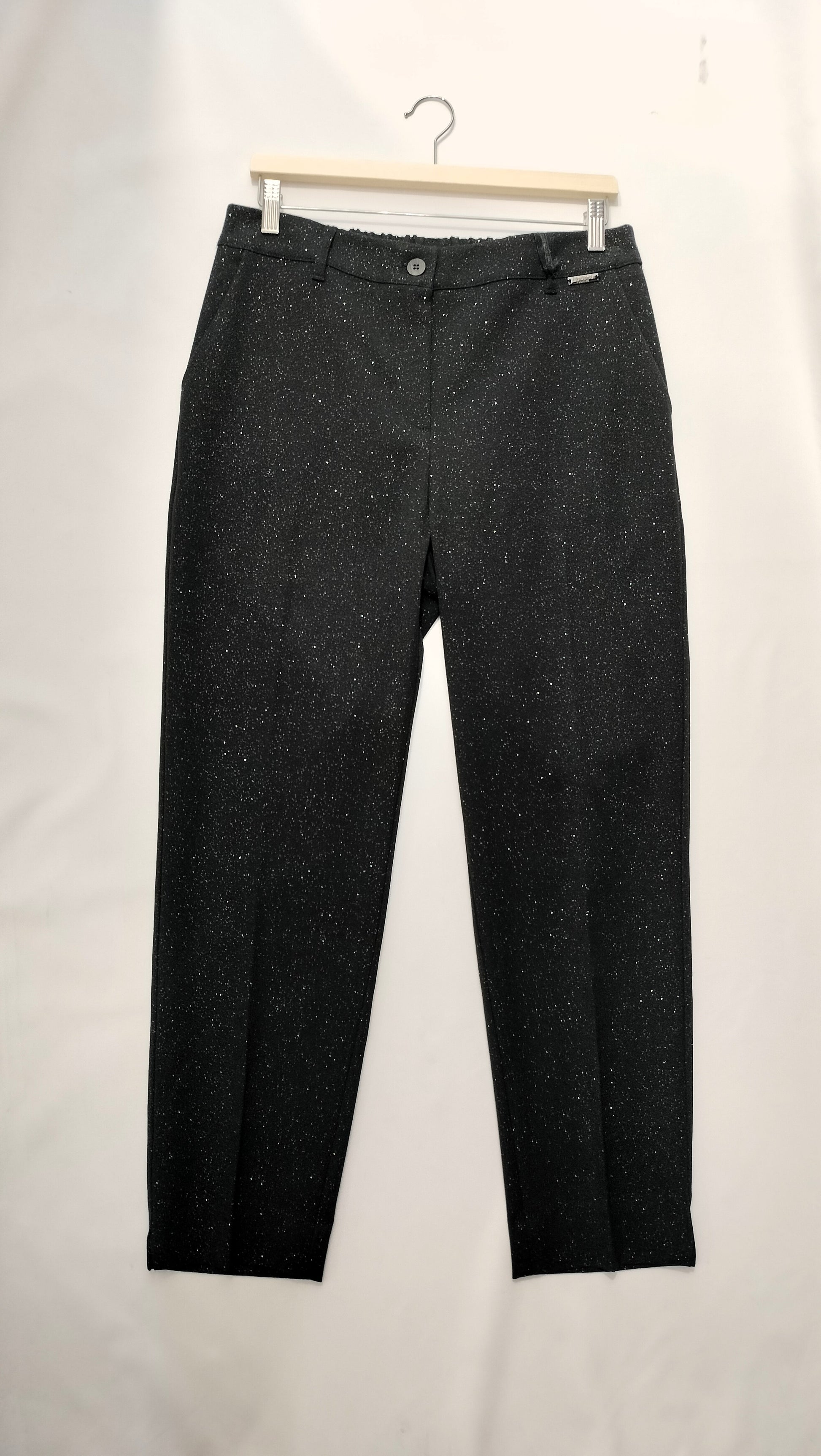 Ref. JR 2708 Pantalón tipo cigarillo con elástico en la parte trasera de la cinturilla. Color negro con brillo plateado, cierre con botón y cremallera, 2 bolsillos laterales