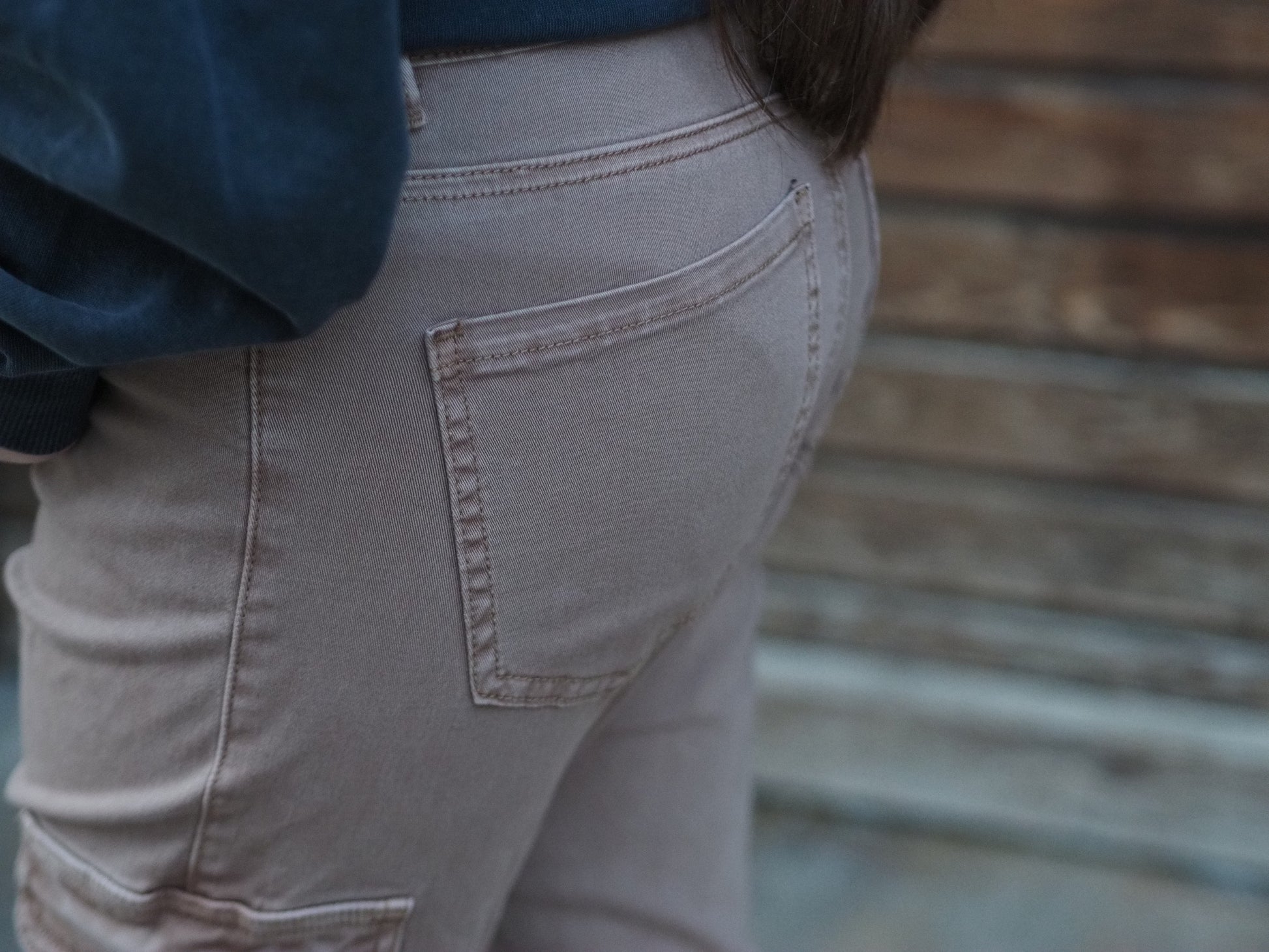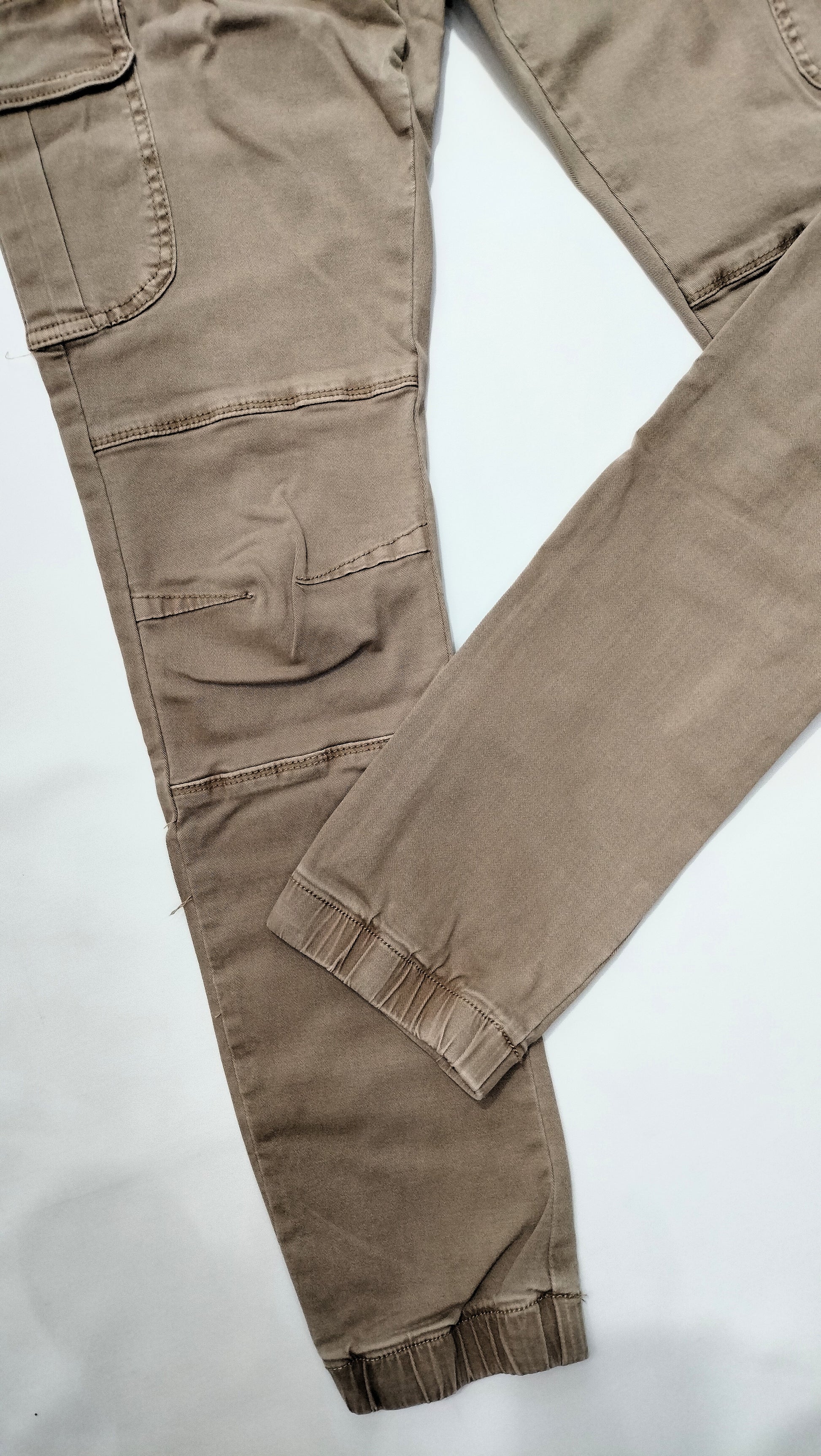 REf. JR QI-801-0136 Pantalón largo pitillo estilo cargo, con bolsillos laterales, goma en el bajo, tiro medio, 2 bolsillos delanteros y 2 traseros. Color tostado