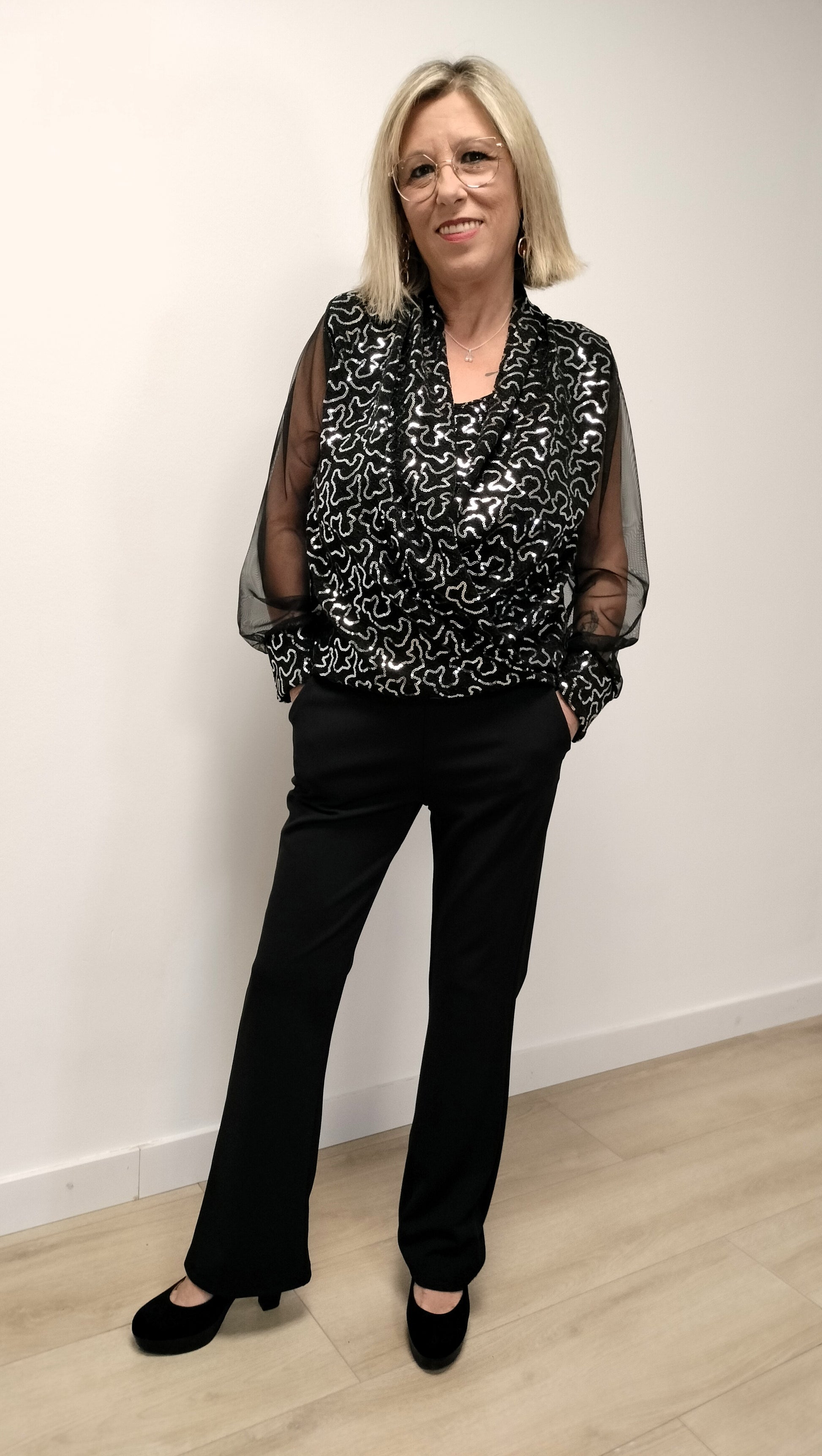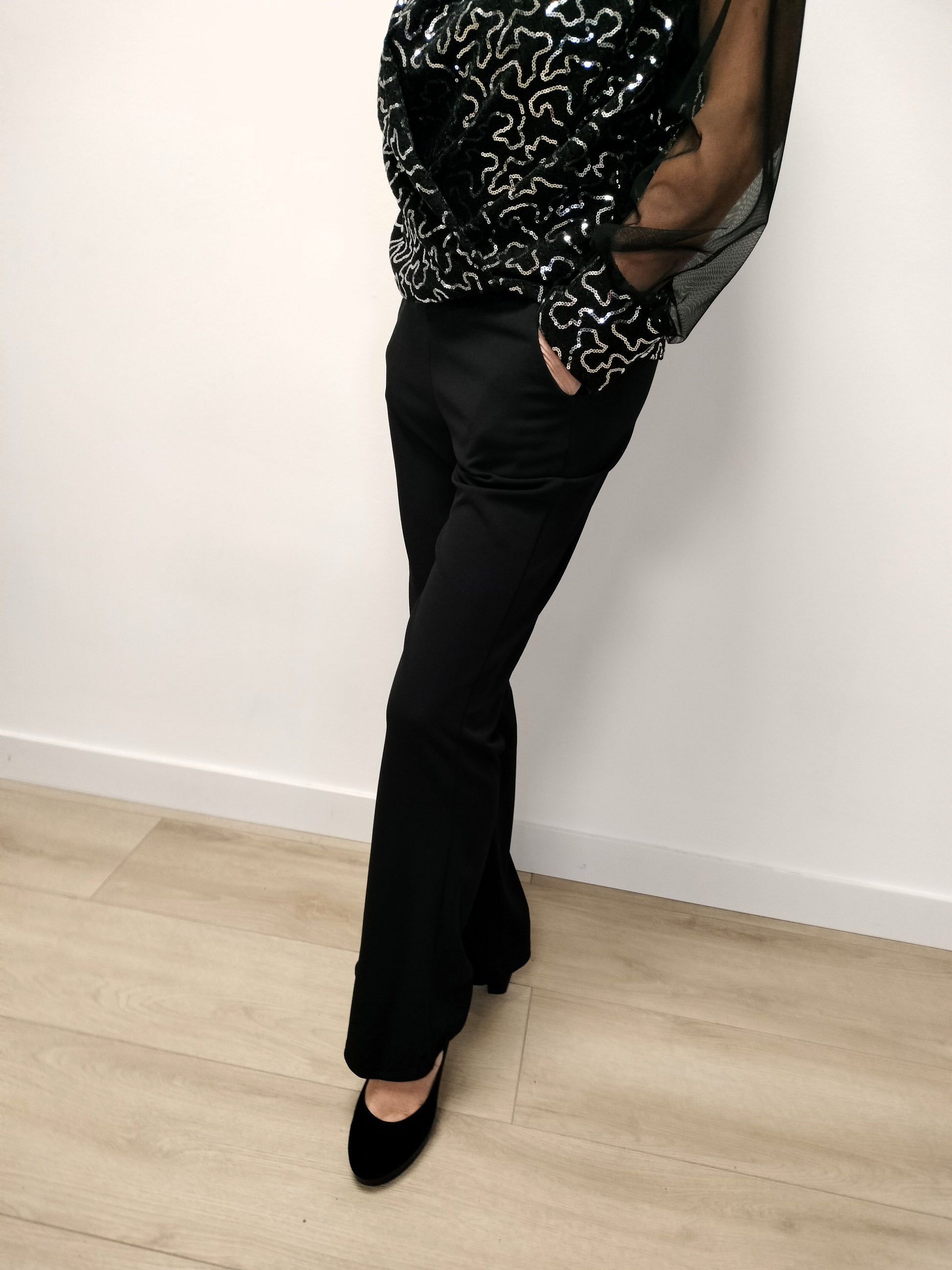 Ref. 1549 Pantalón largo elástico, con goma en la cintura y acabado ligeramente acampanado, corte ceñido. Negro