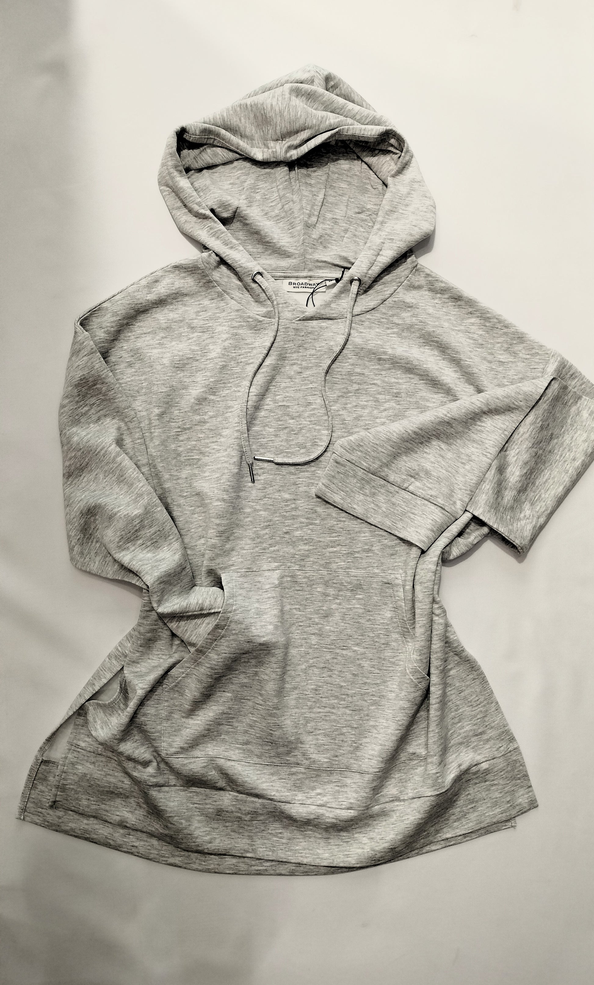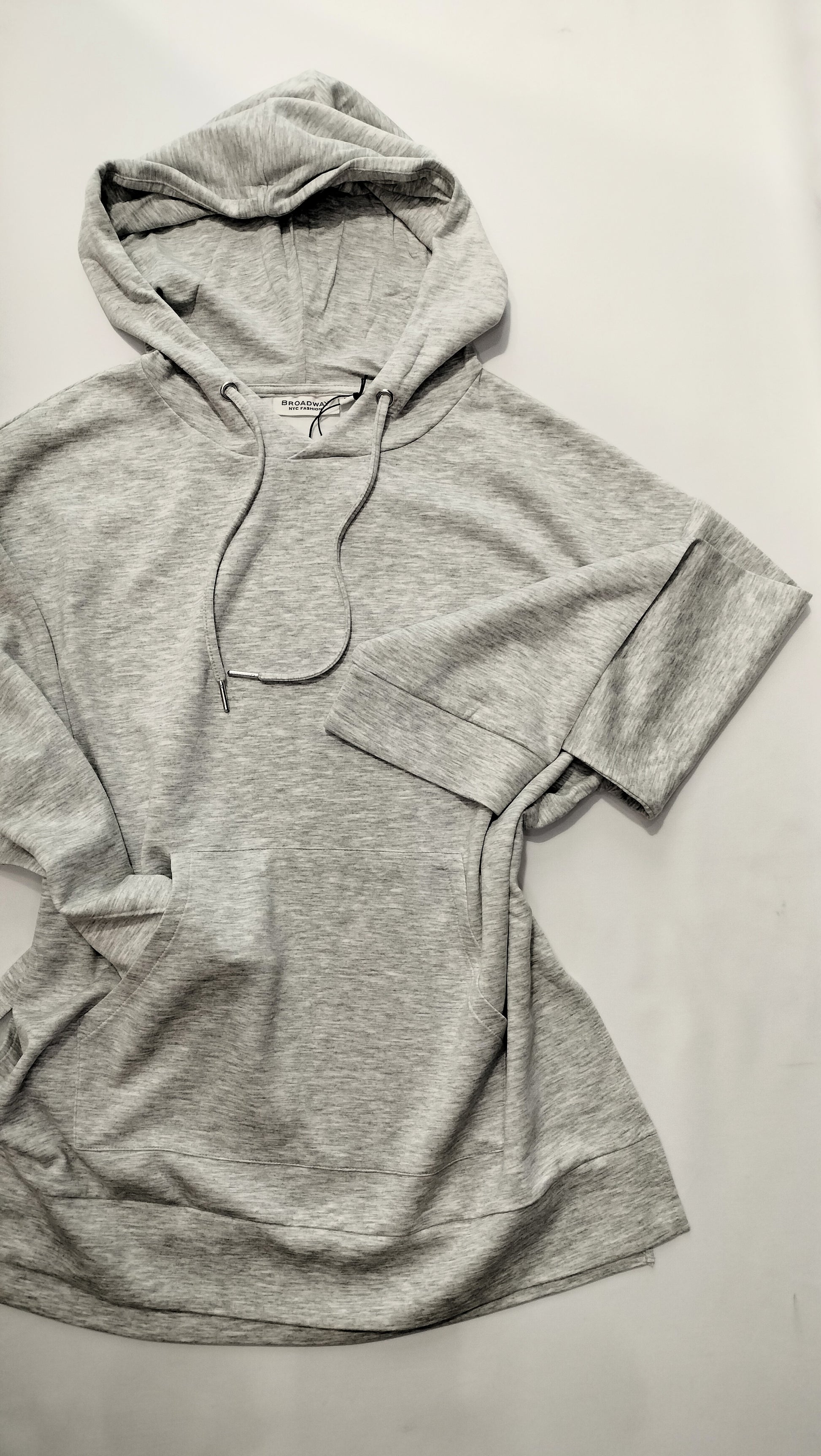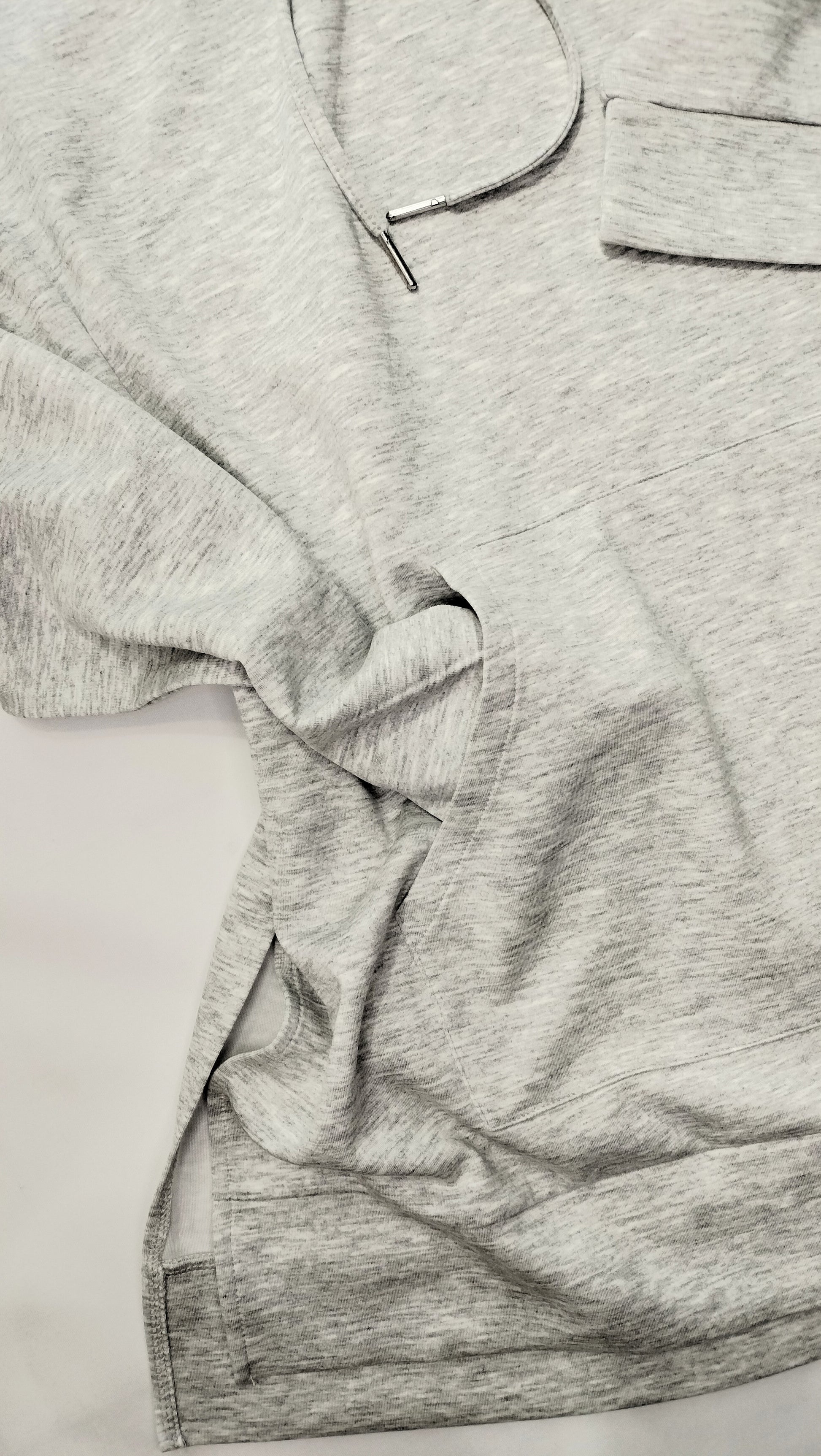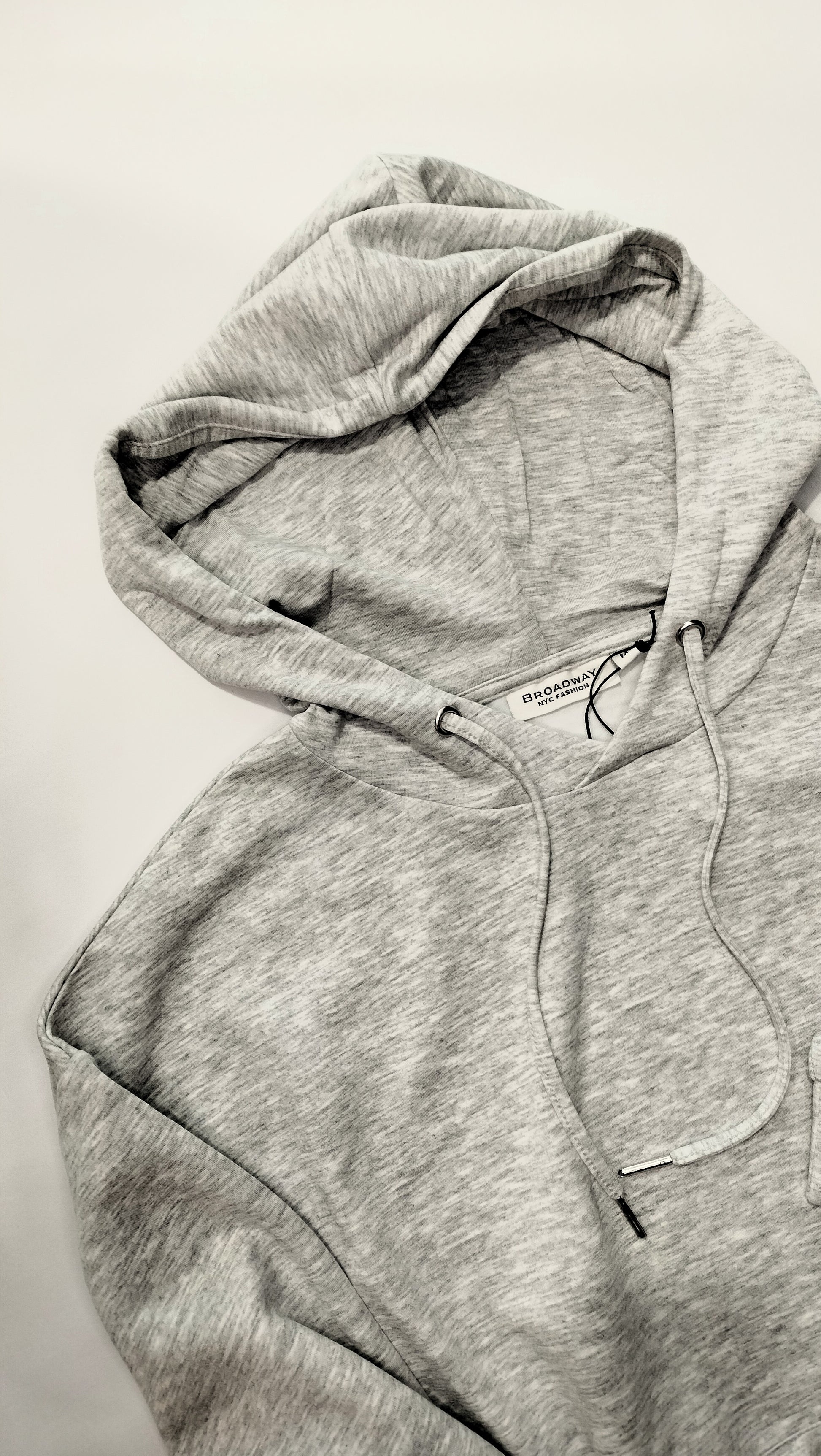 Ref. JR 550002787 Sudadera de punto fino, estilo oversize, manga larga, corte recto, con capucha ajustable y bolsillo doble en la parte frontal. Color gris. Pantalón a juego disponible