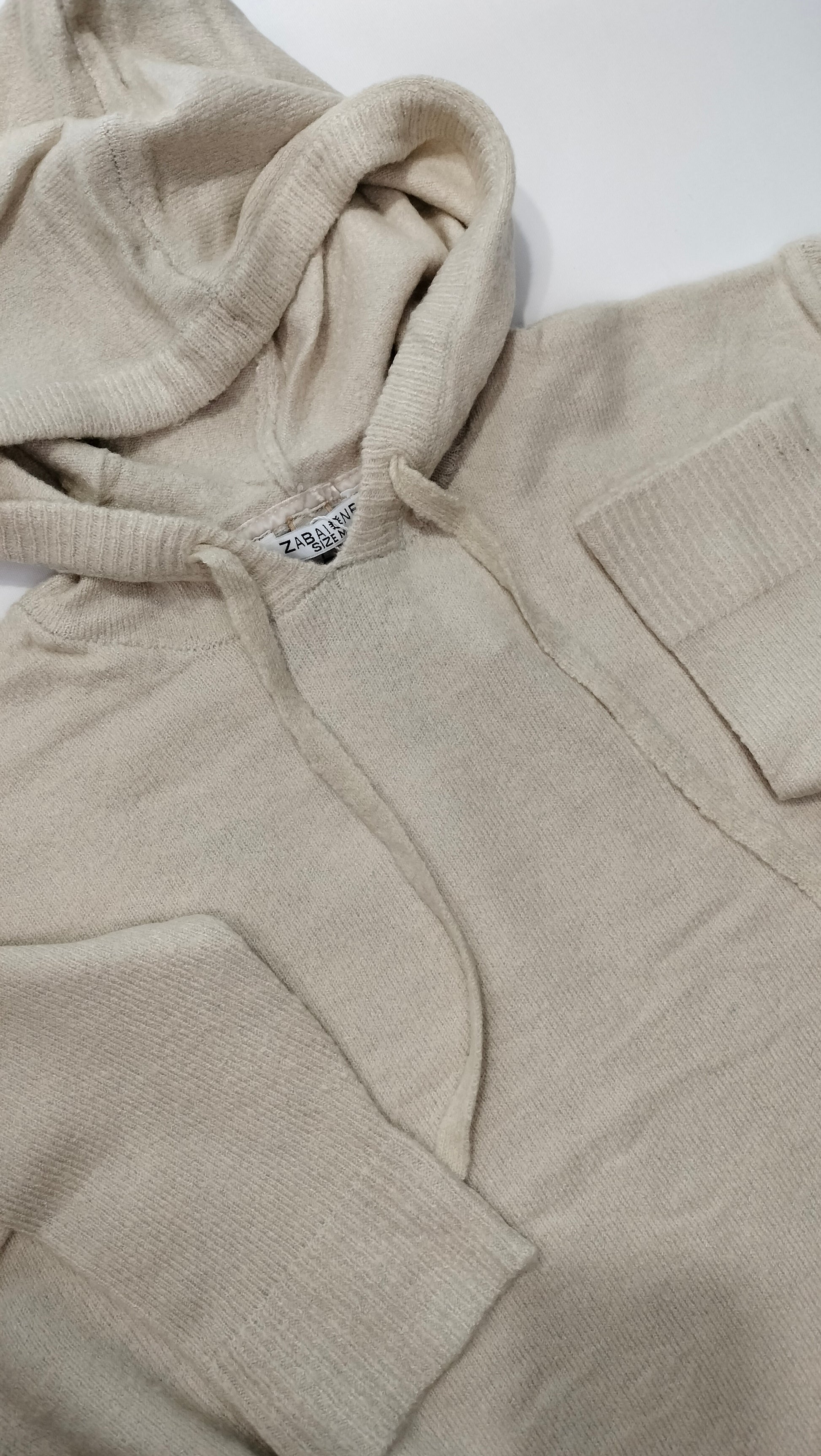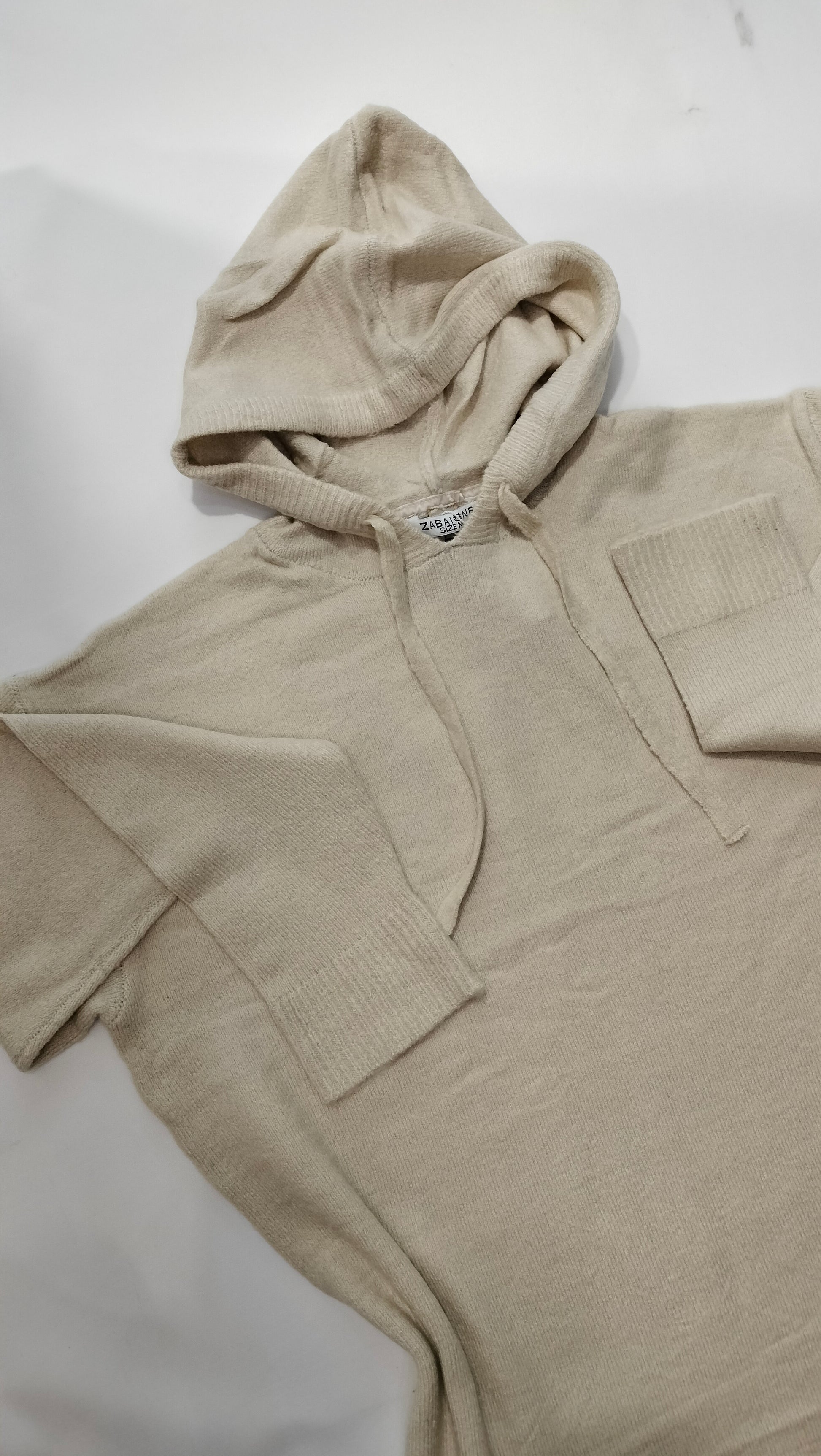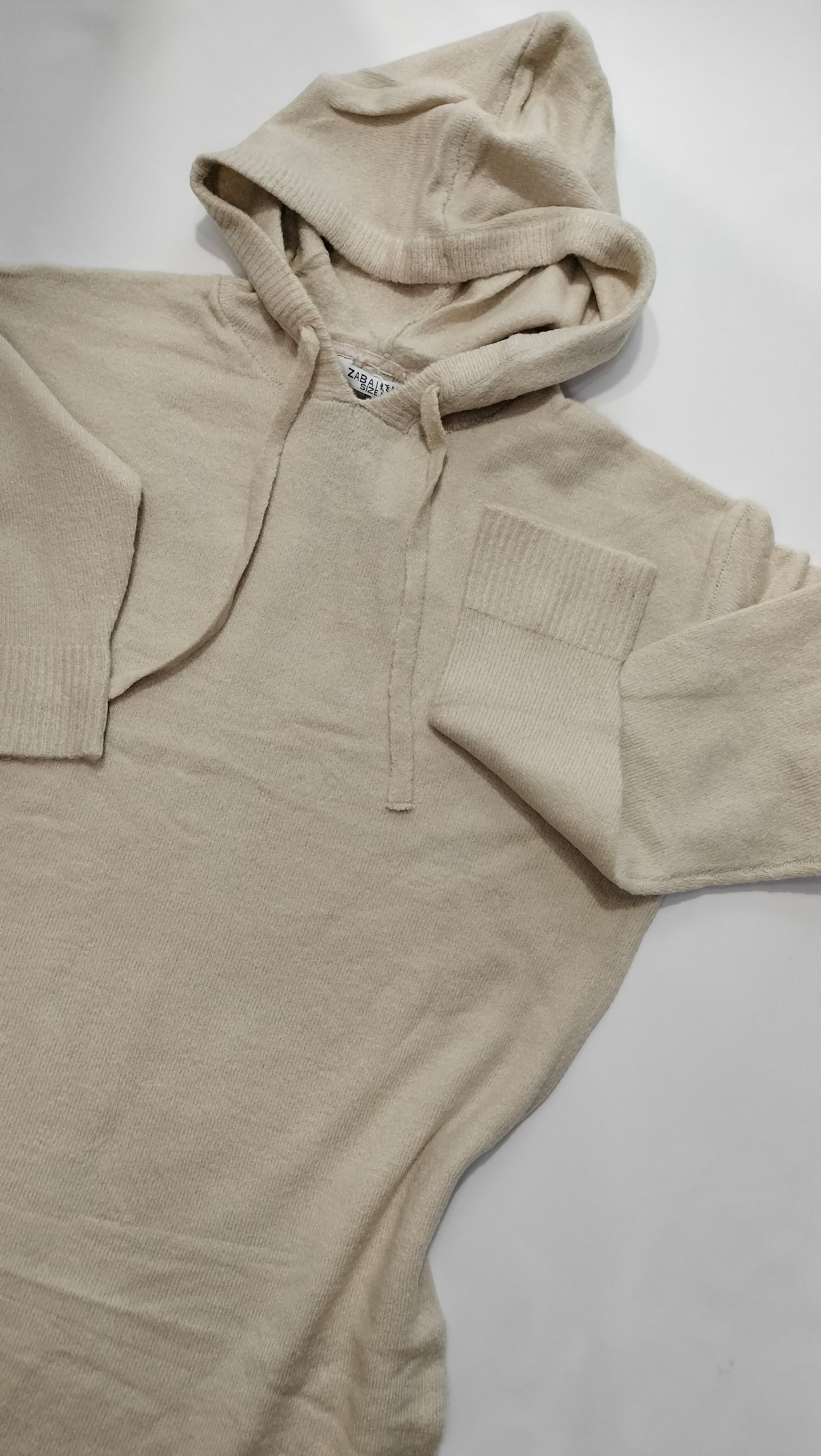 Ref. JR AIM-151-0190 Vestido de punto grueso, manga larga, corte entallado, con capucha ajustable. Color beige
