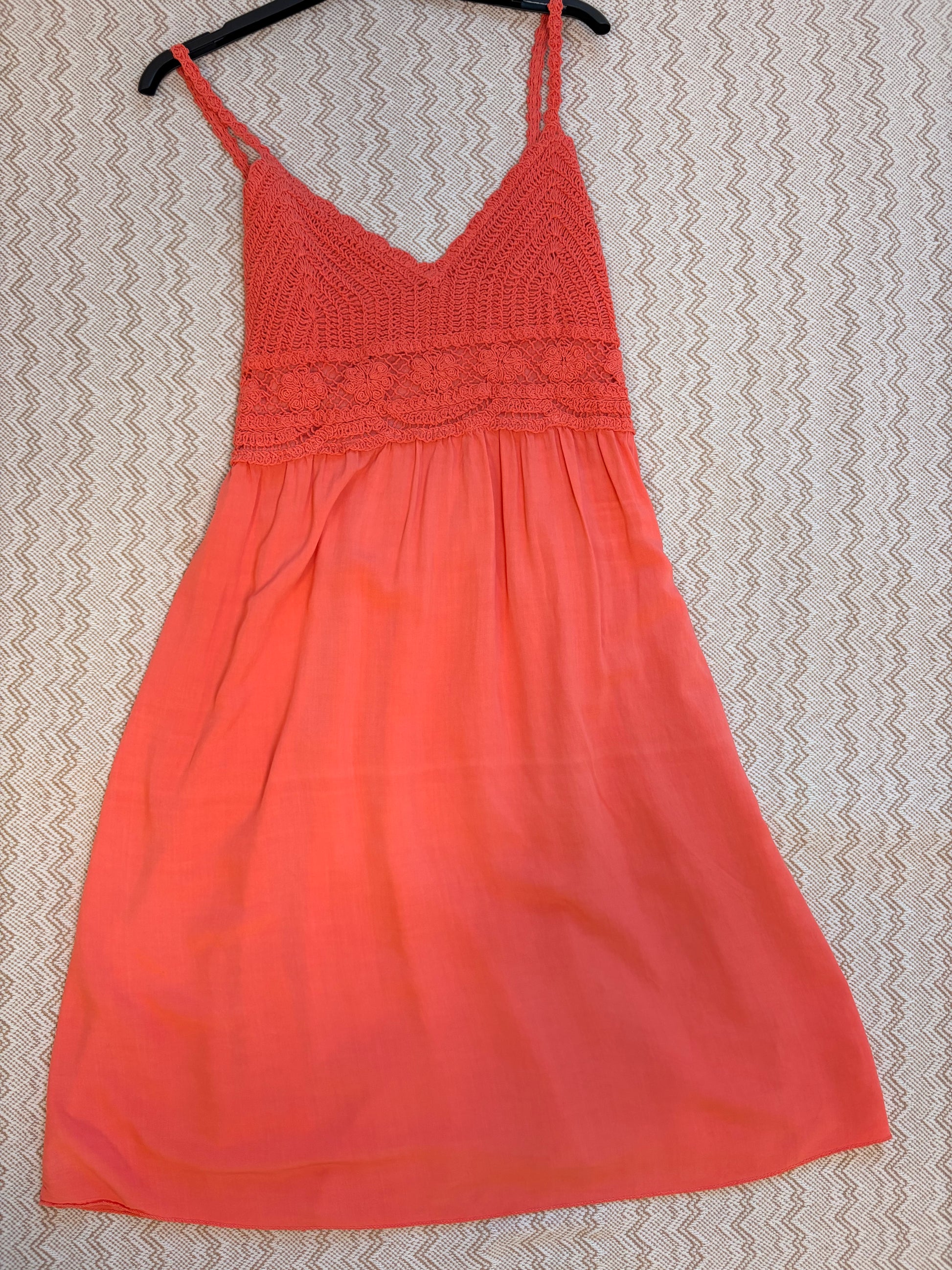 Ref. 70503 Vestido corto de estilo bohemio, liso, con forro, tirantes finos, espalda elástica con nido de abeja, escote crochet en forma de V. Talla única M/L