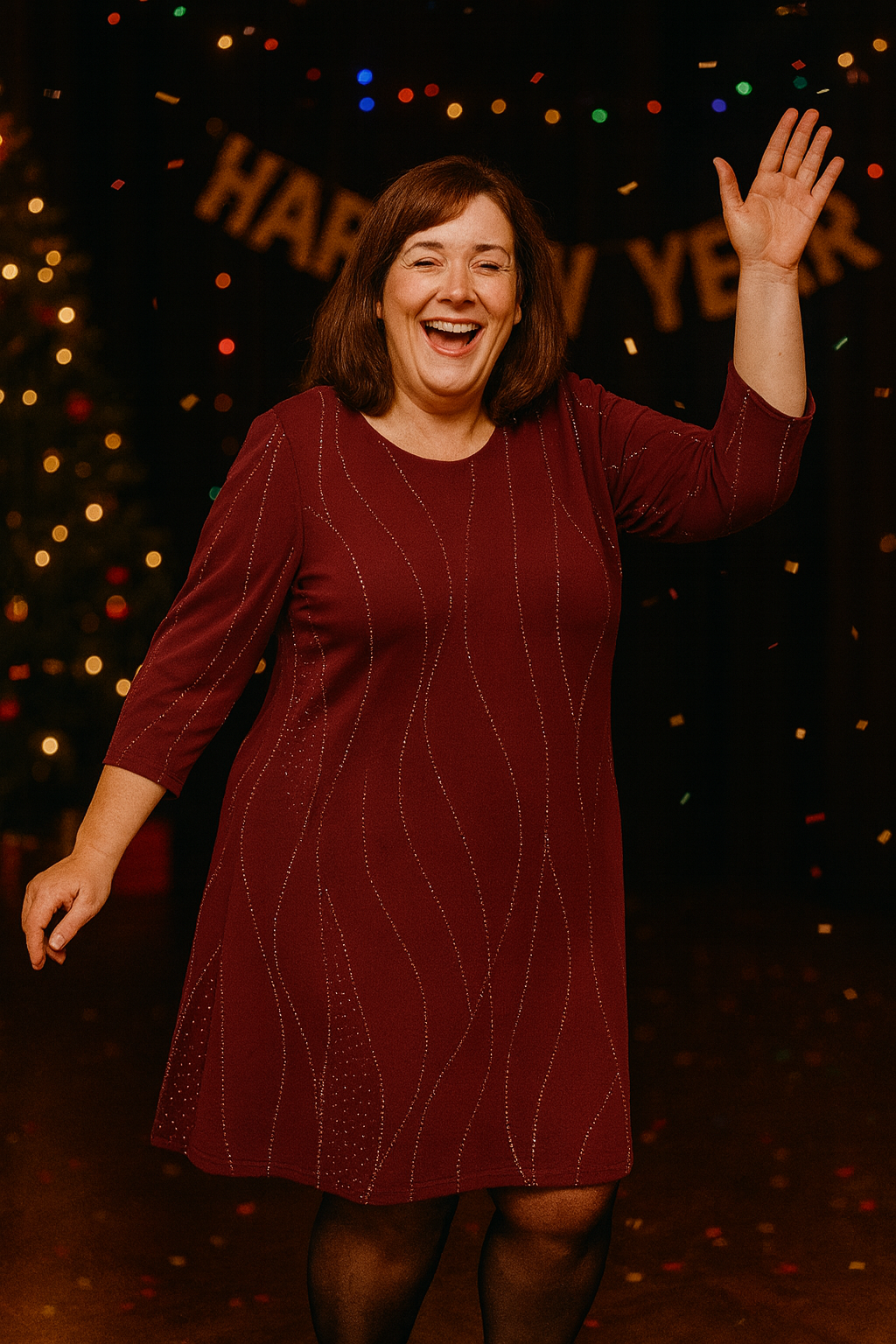 Ref. 3945 Vestido fiesta en color granate con brillos strass plateados, manga 3/4, cuello redondo, corte recto. Talla única curvy, pecho 69 cms