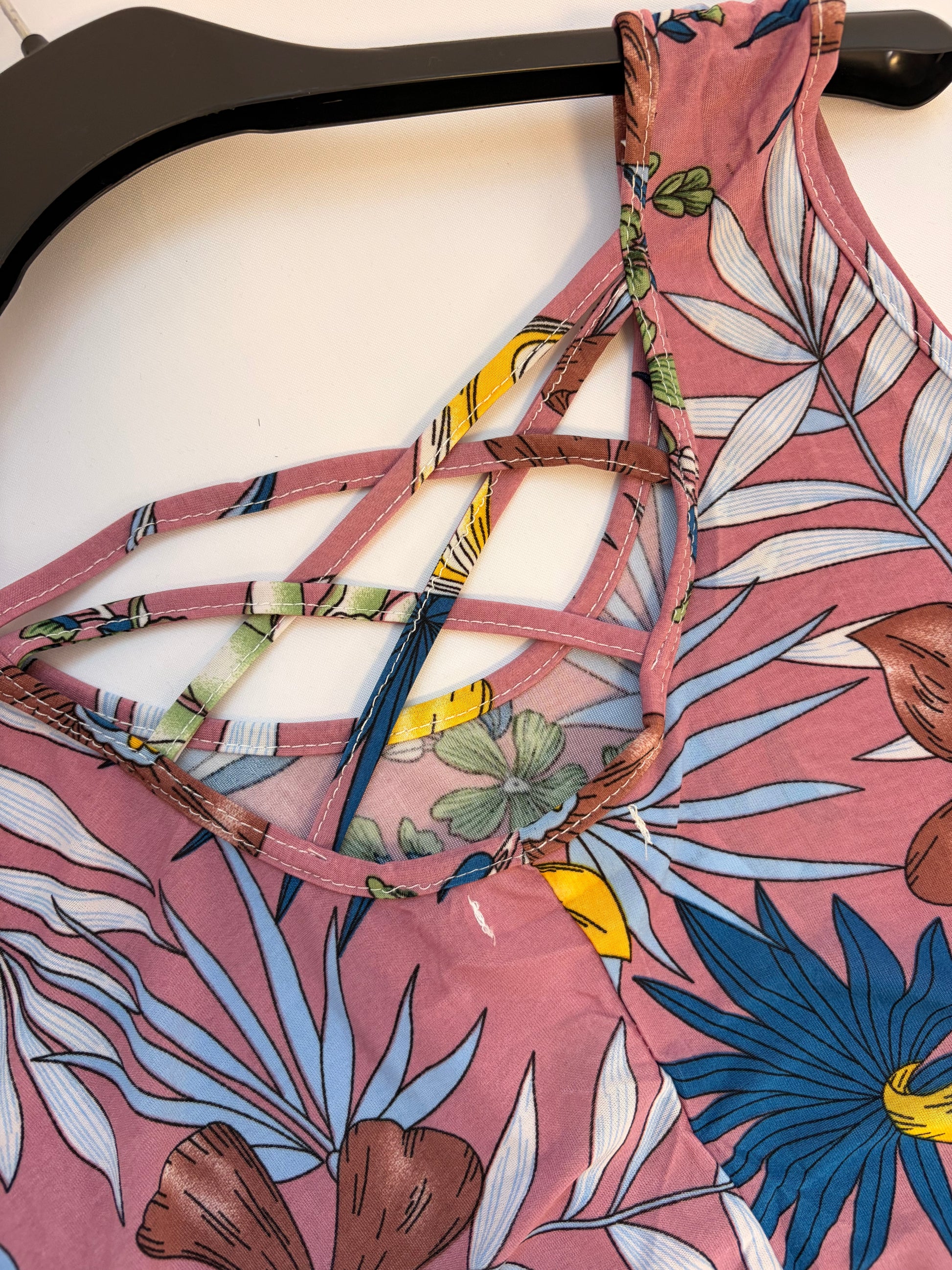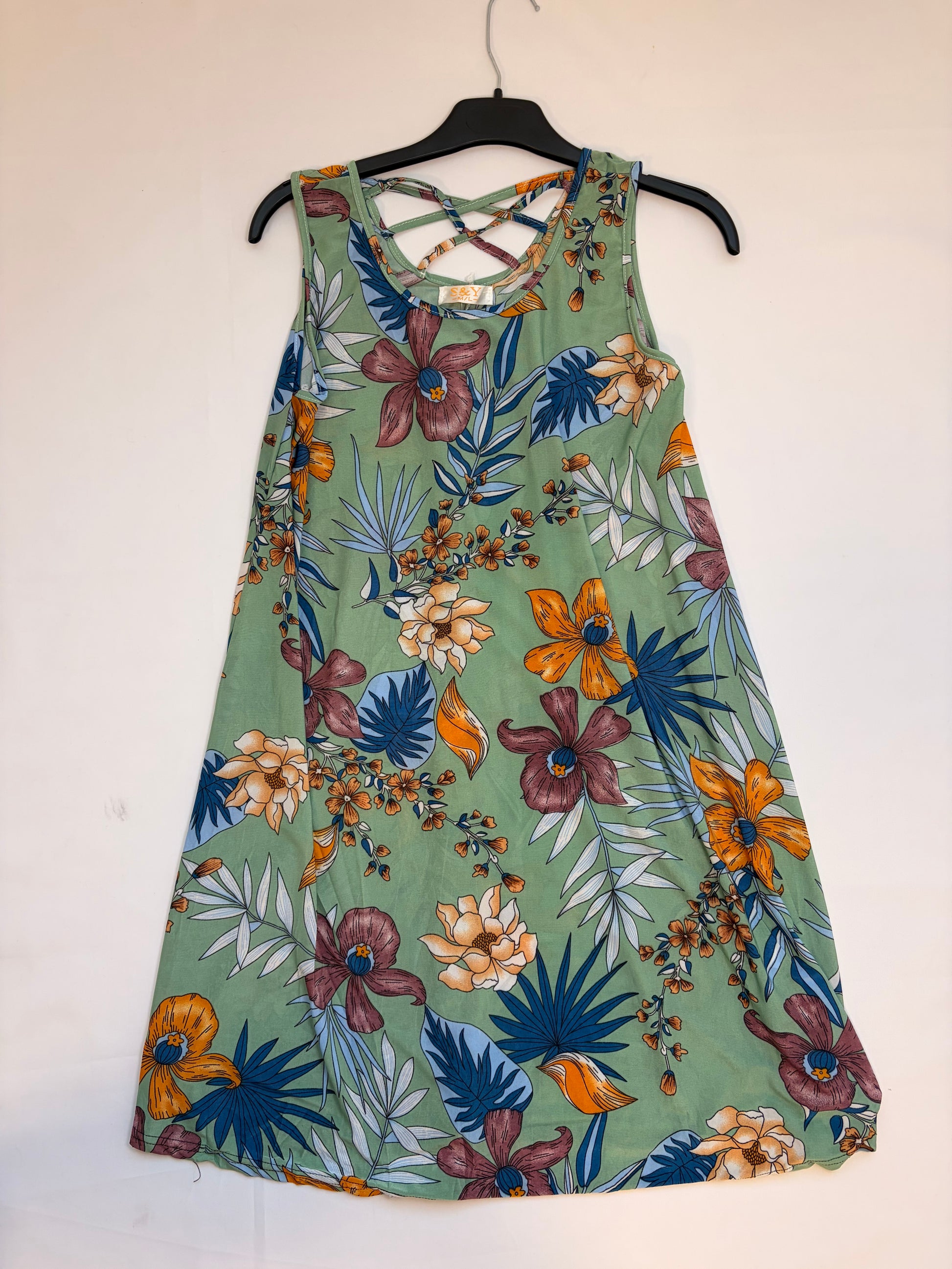 Ref. 2840 vestido de licra fria muy fresco y con mucha caída, sin mangas, corte evasé, suelto, escote redondo y cruzado por la espalda, largo por la rodilla