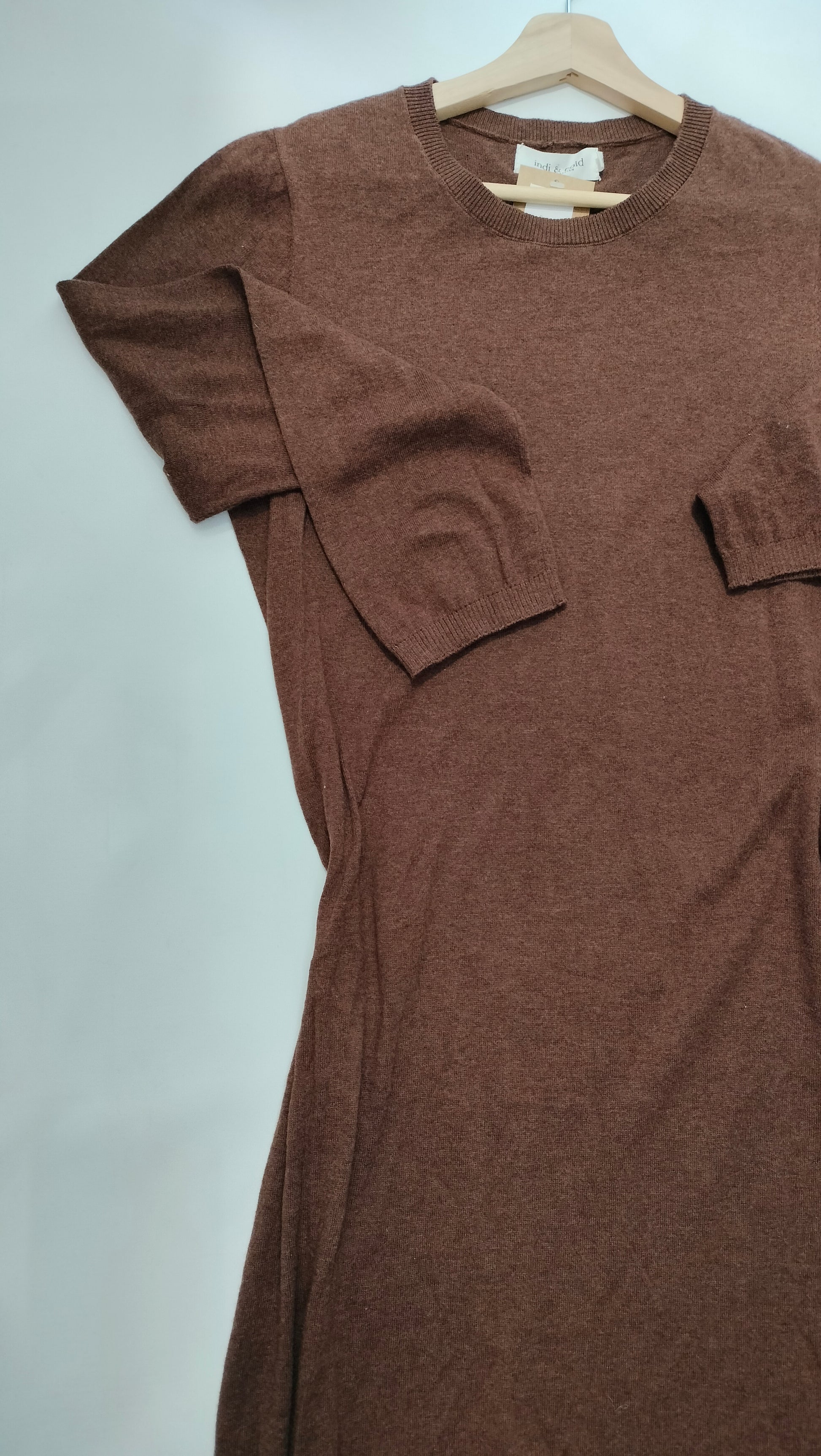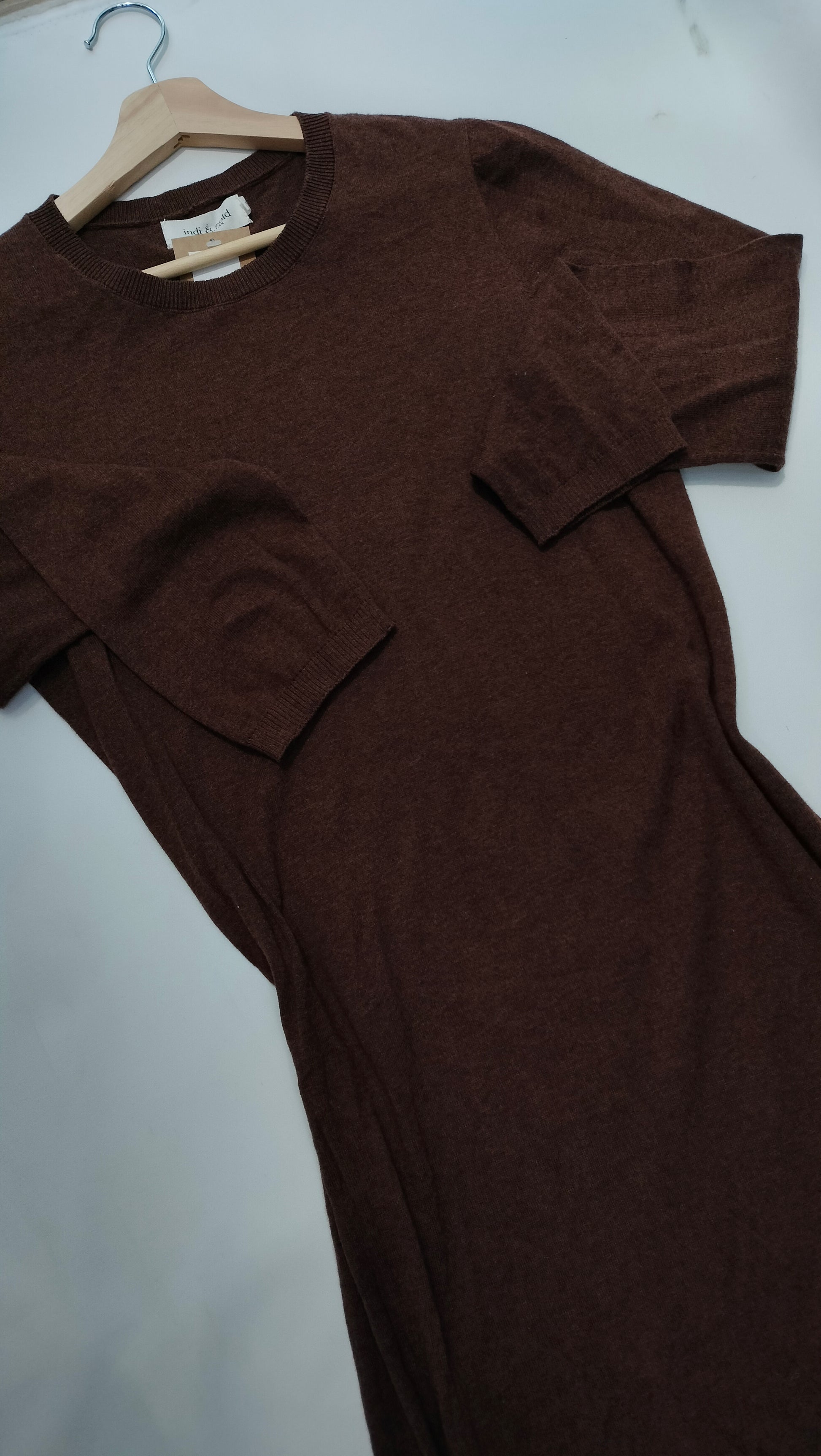 Ref. JR VI23RD121 Vestido largo de punto fino, color marrón oscuro, manga larga, escote redondo, corte ceñido, apertura lateral en el bajo