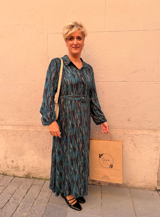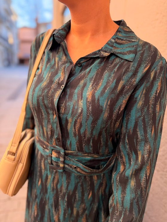Ref. Yokona Vestido camisero largo estampado con manga larga y cinturón del mismo tejido. 100% Viscosa. color azul marino. Tallas: S M L XL